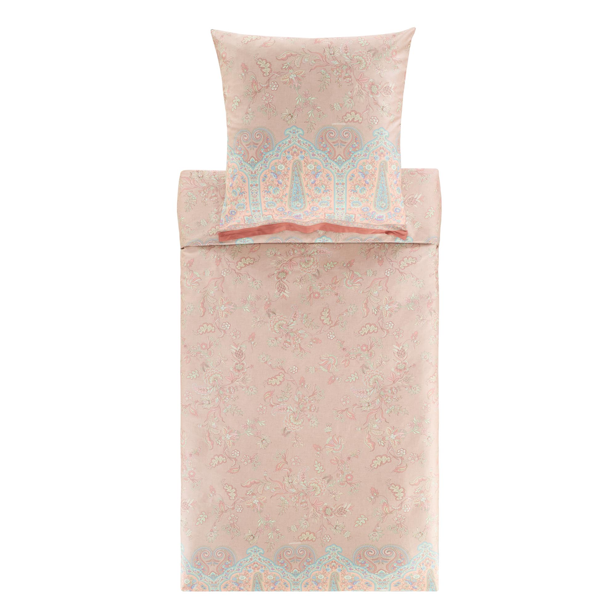 Tauchen Sie ein in die Welt orientalischer Raffinesse mit der Bassetti Bettwäsche Indian Roses 41. Inspiriert von den opulenten Stofftraditionen Persiens und Indiens, vereint dieses Design filigrane florale Ornamente mit kunstvoll interpretierten Paisley-Elementen. Zarte Blüten in Kamelienrosa mit einem Hauch von Fuchsia entfalten sich auf einem weichen Untergrund in sanften Farbverläufen, die dem Muster eine harmonische Leichtigkeit verleihen. Der dekorative Volant betont mit seinen detailreichen Rankenmotiven und dynamischen Paisleyformen die luxuriöse Ausstrahlung dieses Bettwäsche-Sets von Bassetti in Indian Roses 41.