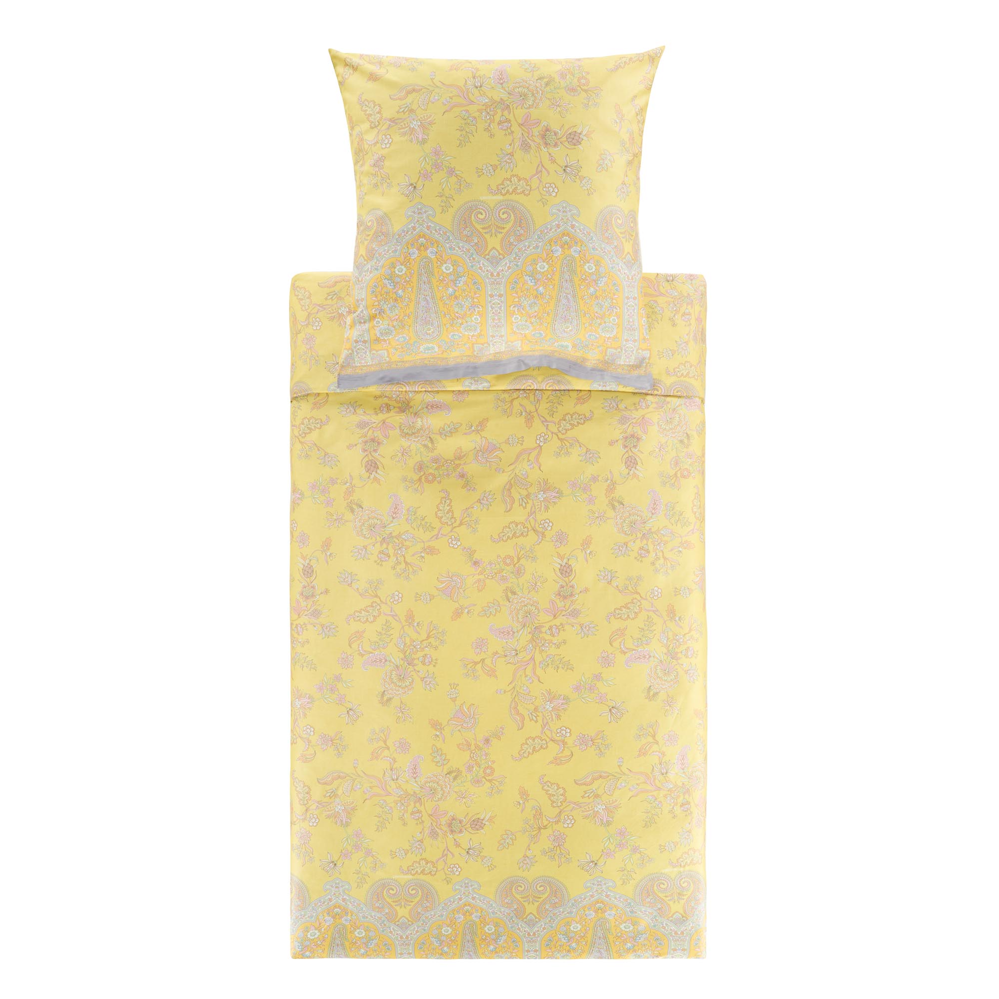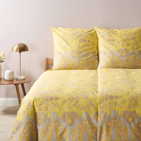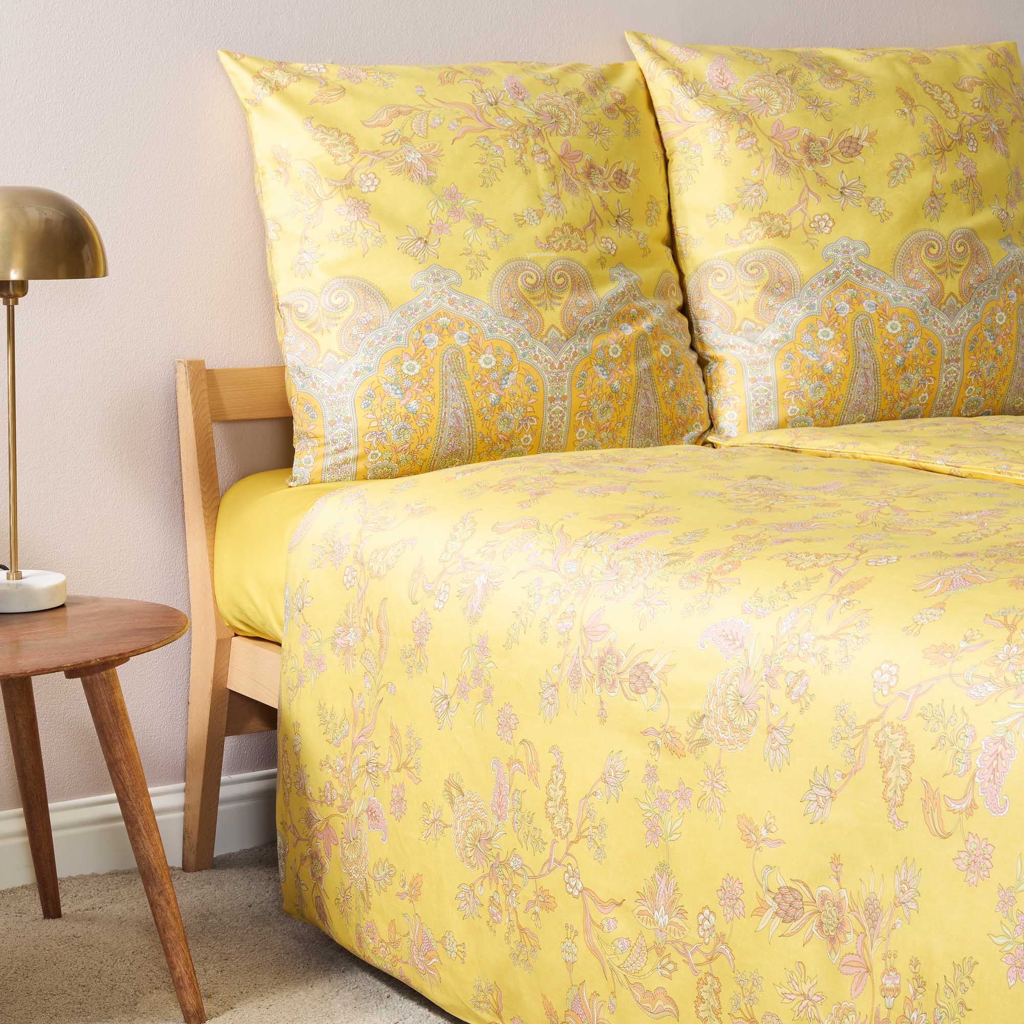 Die Bassetti Bettwäsche Indian Roses Y1 begeistert mit ihrem mediterran inspirierten Design, das die leuchtenden Farben eines italienischen Sommers einfängt. Typisch sind die filigranen Ton-in-Ton-Blumenmotive kombiniert mit elegantem Paisley auf fein gewebtem Mako-Satin aus 100% hochwertiger Baumwolle. Die Bettwäsche ist angenehm weich, atmungsaktiv und pflegeleicht – ideal für warme Sommernächte und entspannte Stunden. Mit warmen Zitronentönen, Sandgelb und zartem Pfirsich verwandelt sie jedes Schlafzimmer in eine stilvolle Wohlfühloase. Das luxuriöse Volant rundet die exklusive Optik ab.