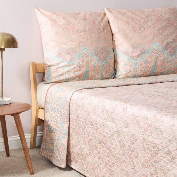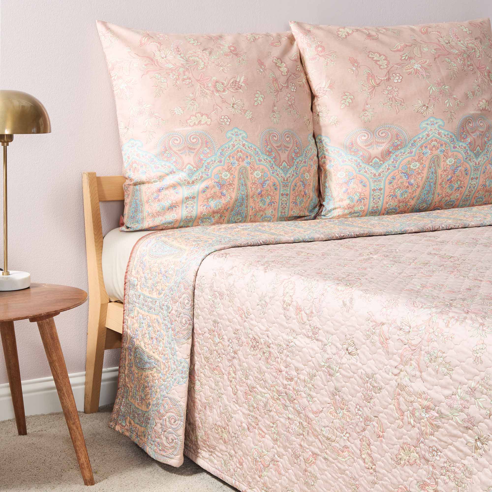 Verwandeln Sie Ihr Schlafzimmer in einen eleganten Rückzugsort mit der gesteppte Tagesdecke Indian Roses 41 von Bassetti. Die meisterhafte Kombination aus floralen Elementen und kunstvollen Paisley-Motiven macht dieses Design zu einem Highlight jeder Einrichtung. In zartem Kamelienrosa mit einem Hauch von Fuchsia schimmert die Oberfläche sanft und reflektiert die Lichtspiele eines sonnendurchfluteten Raumes.