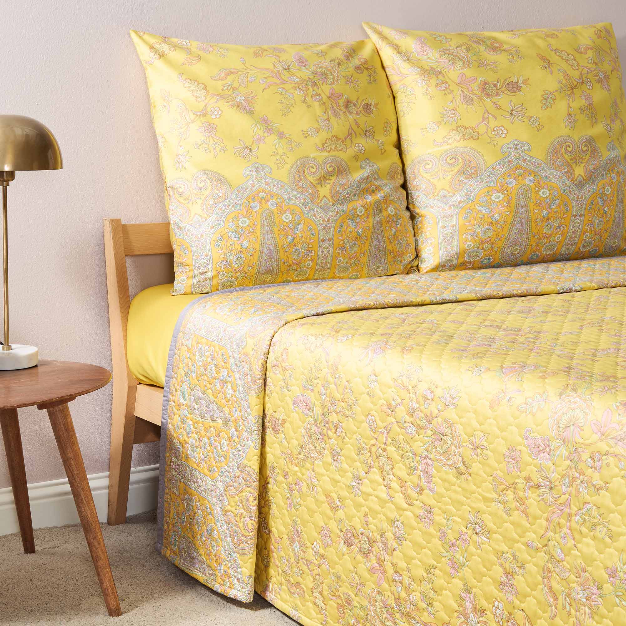 Die gesteppte Tagesdecke Indian Roses Y1 von Bassetti verbindet traditionelle Eleganz mit modernem Luxus und schafft eine Atmosphäre der Ruhe und Behaglichkeit. Inspiriert von den sanften Lichtspielen eines apulischen Sommers, vereint dieses Design warme Zitronen- und Sandtöne mit zarten Nuancen in Blush, Elfenbeinweiß und Pfirsich. Die detailreichen floralen Muster und die kunstvoll eingearbeiteten Paisley-Elemente spiegeln die Raffinesse persischer und indischer Stofftraditionen wider, die in dieser Kollektion eine moderne Neuinterpretation erfahren.