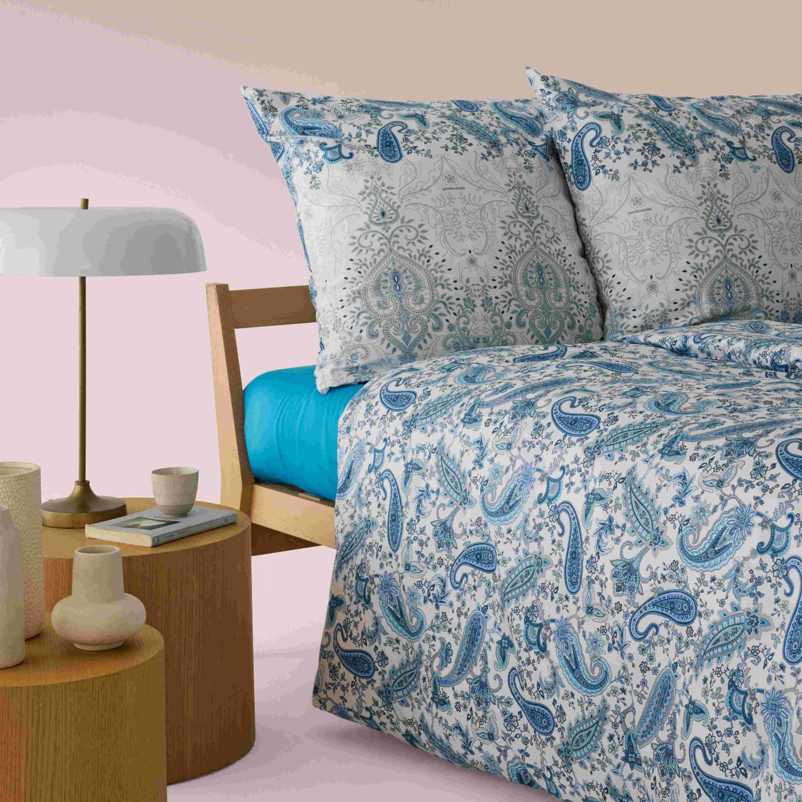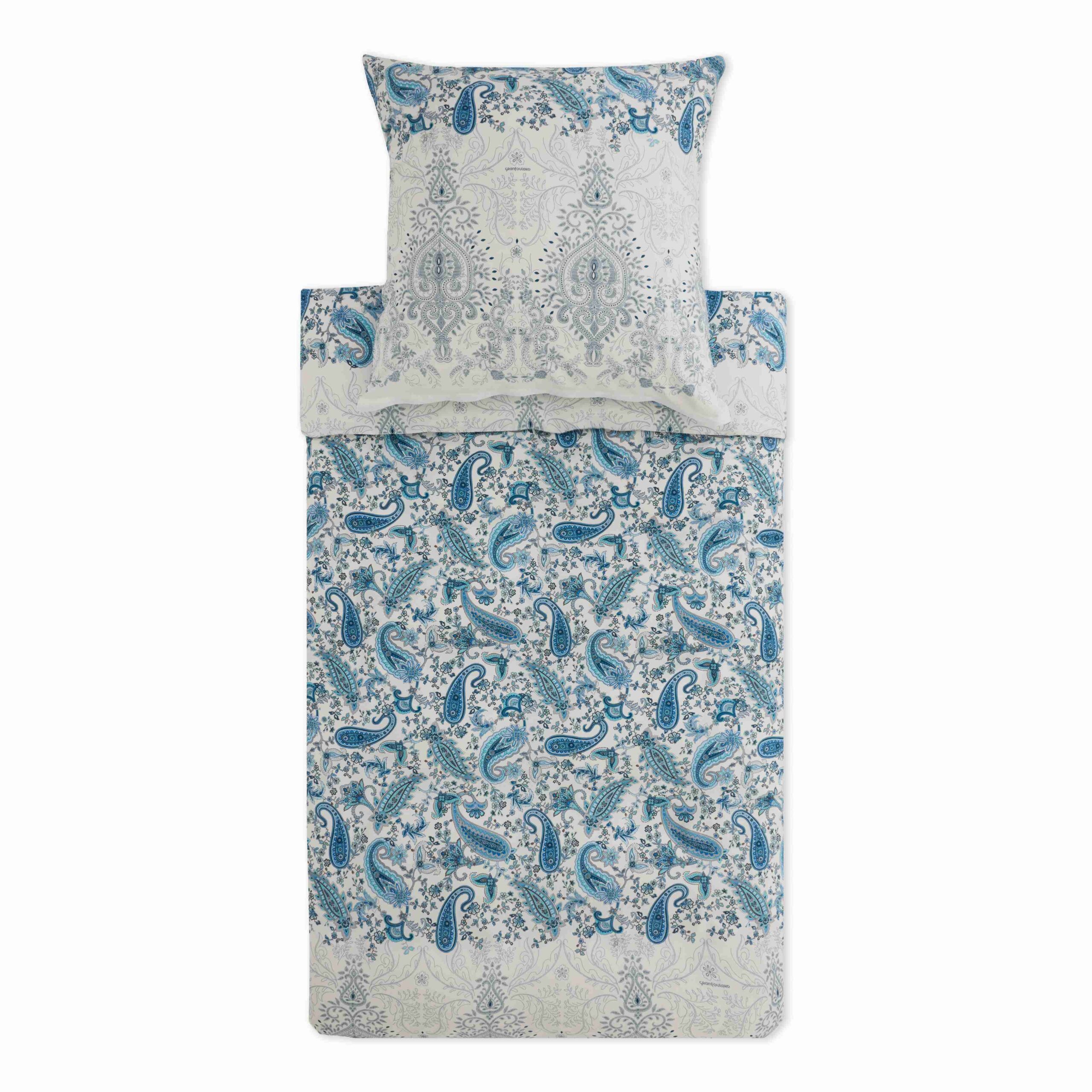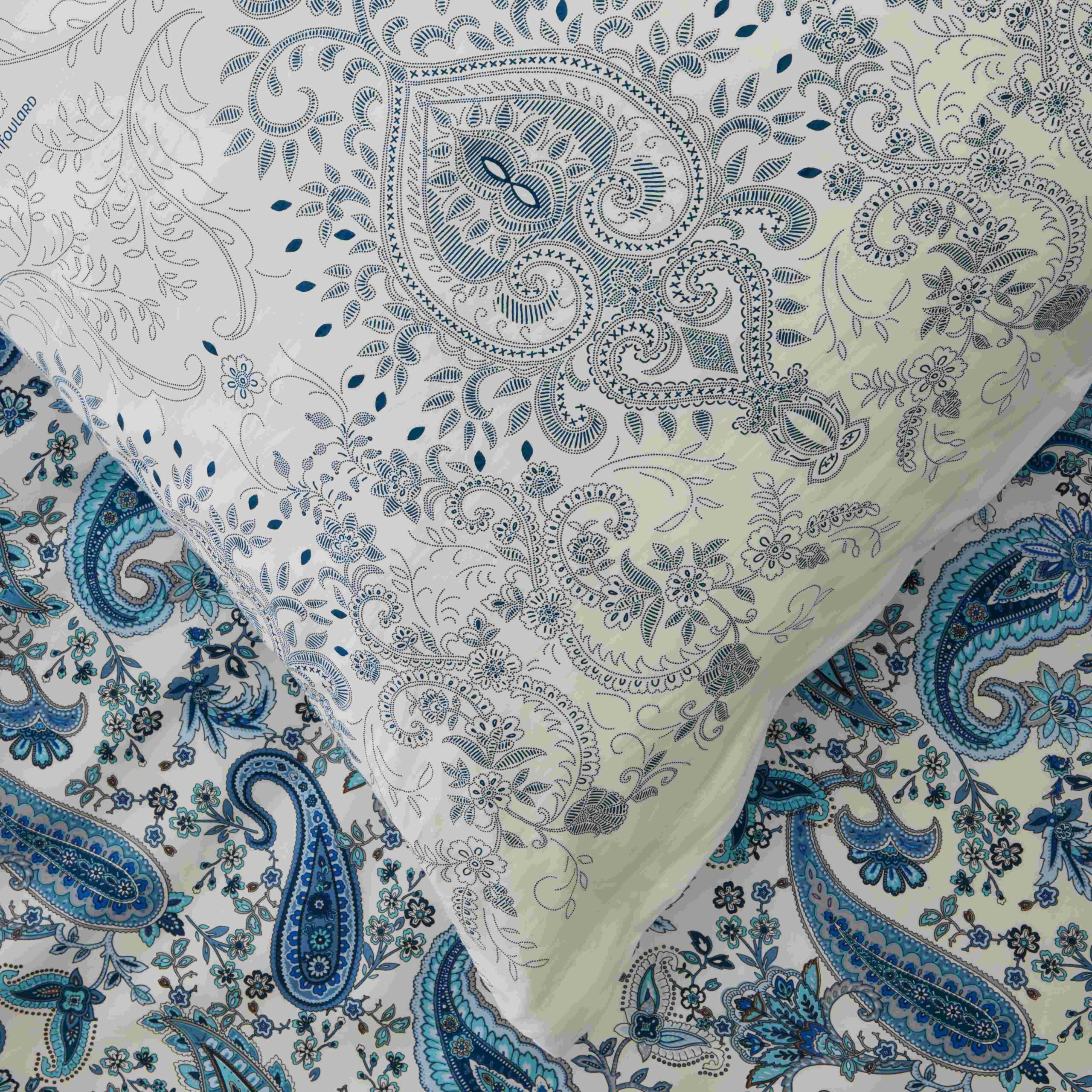 Die Bassetti Bettwäsche Monnalisa C1: Wie ein tiefer Atemzug am frühen Morgen, wenn die Gischt des Meeres noch in der Luft liegt: Unsere Monnalisa-Bettwäsche in der Variante C1 bringt die unvergleichliche Frische des Sommers in Ihr Schlafzimmer. Auf einem strahlend weißen Hintergrund entfaltet sich das raffinierte Paisley-Muster in lebendigen Türkis- und Blautönen. Die feinen Ornamente wirken wie tanzende Wellen, die sanft über den Stoff gleiten. Diese Farbkombination strahlt eine unnachahmliche Leichtigkeit aus und lässt den Raum optisch weit und luftig wirken. Wenn Sie sich abends in diese hochwertige Baumwolle sinken lassen, umhüllt Sie das Gefühl von Reinheit und kühler Eleganz. Es ist das ideale Design für alle, die das Maritime lieben, aber auf eine künstlerische, anspruchsvolle Note nicht verzichten möchten. Erwachen Sie jeden Tag mit dem Gefühl, dass der Ozean nur einen Steinwurf entfernt liegt – klar, frisch und voller neuer Möglichkeiten.
