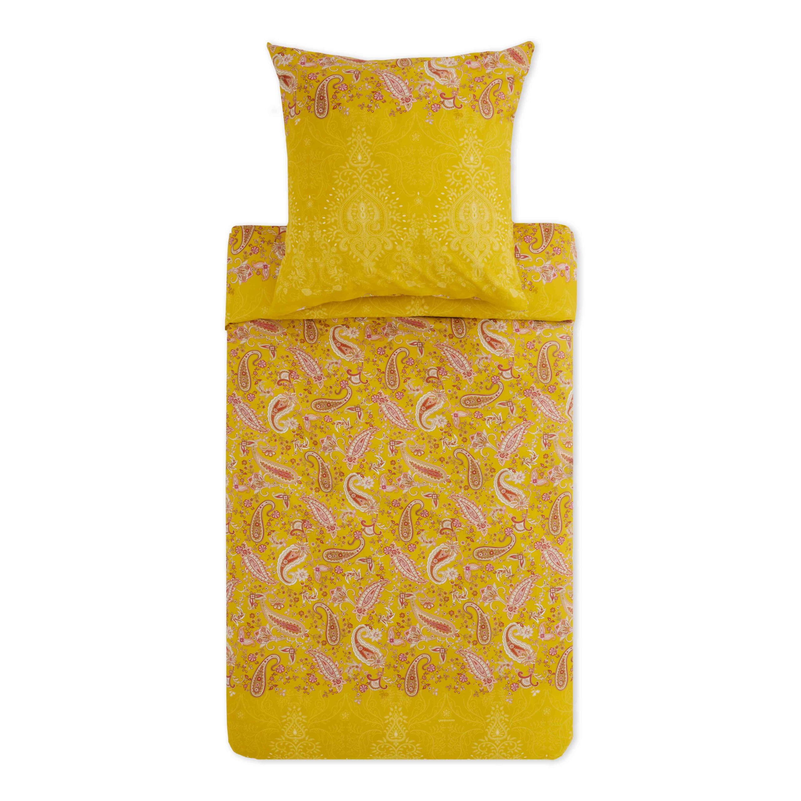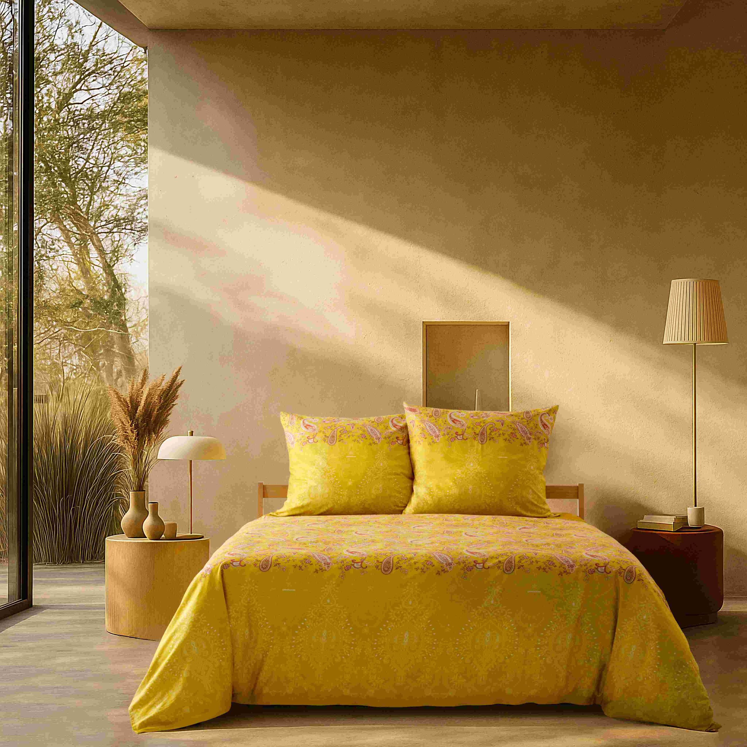 Die Bassetti Bettwäsche Monnalisa Y1: Wenn die Sonne tief steht und die Welt in ein warmes, goldenes Licht taucht, beginnt die Magie der Variante Y1. Unsere Monnalisa-Bettwäsche in dieser sonnigen Ausführung ist eine Hommage an die Wärme des Südens. Die exquisiten Paisley-Muster erstrahlen hier in einer reichen Palette aus Bernstein, Ziegelrot und sanftem Rosa, geerdet durch dezente khaki-Töne. Diese Farben strahlen eine tiefe Geborgenheit und Behaglichkeit aus, die Ihr Schlafzimmer in einen luxuriösen Rückzugsort verwandelt. Das Spiel der warmen Nuancen wirkt harmonisch und belebend zugleich, wie ein spätsommerlicher Garten in der Toskana. Wer sich in diese Bettwäsche hüllt, spürt die Energie der Sonne und die Ruhe der Erde. Es ist das perfekte Design für Genießer, die eine warme, einladende Atmosphäre schätzen und ihr Schlafzimmer mit einer Prise Exotik und zeitloser Eleganz veredeln möchten.