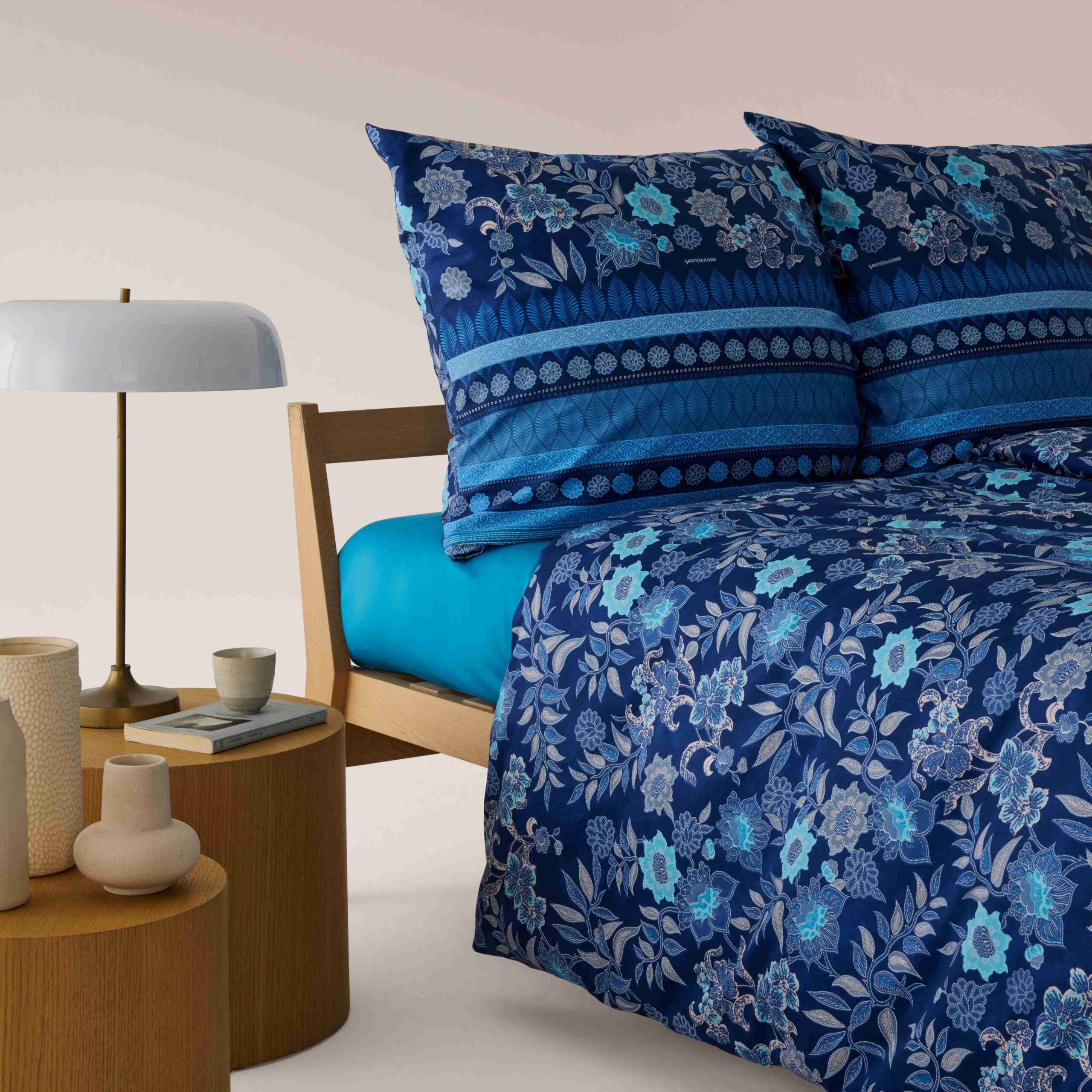 Die Bassetti Bettwäsche Varigotti B1: In dieser Fresh-Version gewinnt das Batik-Blumenmuster der Varigotti Bettwäsche vB1 von Bassetti eine neue, fast aquarellartige Leichtigkeit. Die exotischen Blüten heben sich kontrastreich vom tiefblauen Fond ab, während die filigranen Ranken eine elegante, fließende Struktur schaffen. Die ikonische Volant-Bordüre rahmt das Dessin in klaren Linien und unterstreicht die grafische Präzision des Dessins von Bassetti. Das Varigotti Duvet Cover Set vB1von Bassetti in Fresh steht für RE-SET – ein Neuausrichten auf Frische, Klarheit und moderne Leichtigkeit. Granfoulard Bassetti verbindet hier ornamentale Tradition mit einer kühlen, zeitgemäßen Farbwelt. Diese Farbvariante des Varigotti Duvet Cover Set vB1 von Bassetti Dessins eignet sich ideal für helle, moderne Räume, in denen Leichtigkeit und Eleganz im Vordergrund stehen. Das Zusammenspiel aus floraler Detailfülle und maritimer Farbgebung erzeugt ein Ambiente von Frische und Weite – wie ein Sommertag an der ligurischen Küste. Das Varigotti Duvet Cover Set vB1 in der Farbvariante Fresh von Granfoulard Bassetti fängt die klare, maritime Atmosphäre der Riviera ein. Marineblau, Blaugrün und Himmelblau verschmelzen im Varigotti Dessin von Bassetti zu einer kühlen, erfrischenden Komposition, die an das glitzernde Wasser des Ligurischen Meeres erinnert.