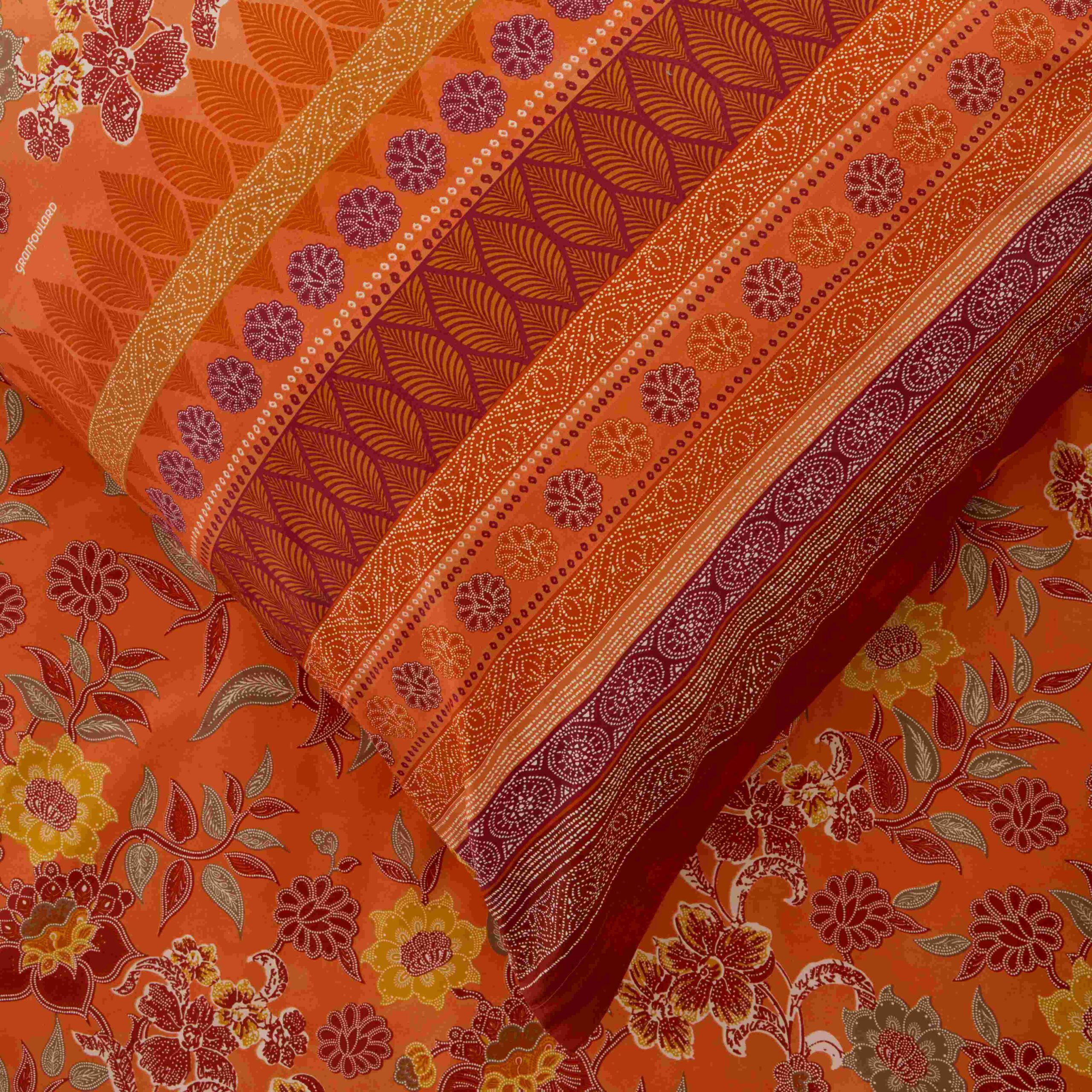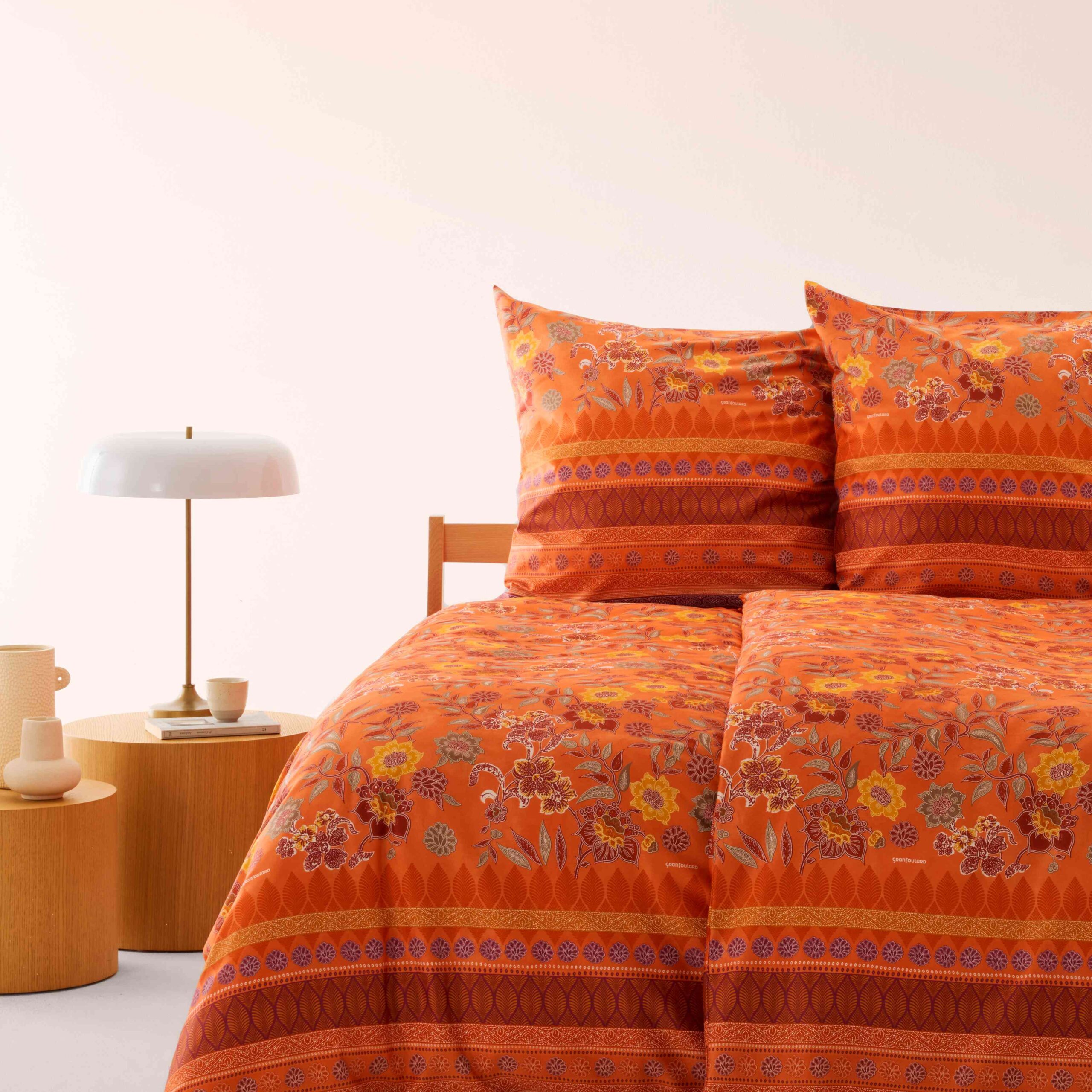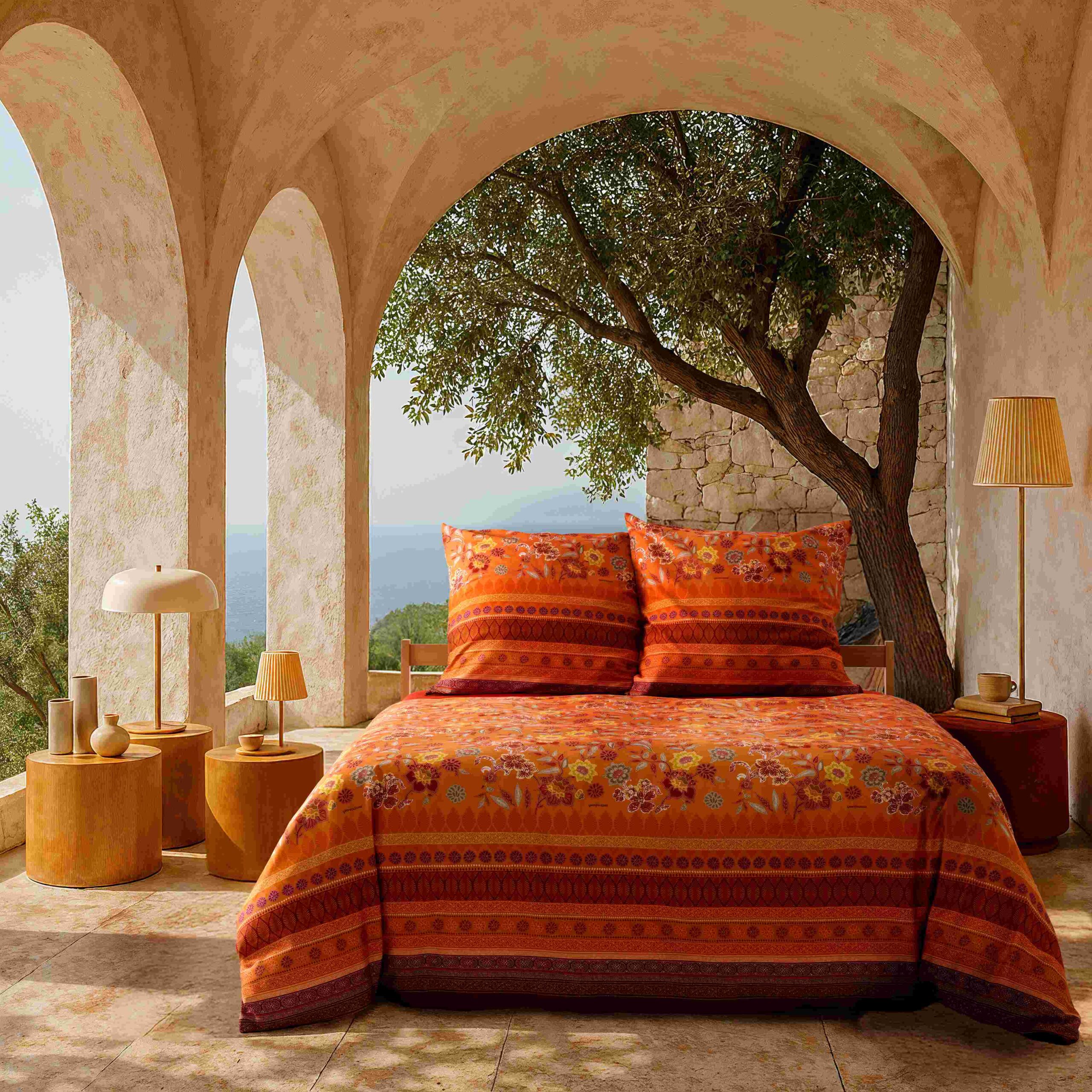 Die Bassetti Bettwäsche Varigotti O1: Das Varigotti Duvet Cover Set vO1 in der Farbvariante Warm von Granfoulard Bassetti Dessins interpretiert das botanische Dessin mit leidenschaftlicher Intensität. Kirschorange und strahlende Gelbtöne verleihen dem Varigotti Design von Bassetti eine energiegeladene Ausstrahlung, die an die leuchtenden Fassaden der ligurischen Küstendörfer im Abendlicht erinnert. In dieser Warm-Version entfaltet das Batik-Blumenmuster des Varigotti vO1 Dessins von Bassetti eine kraftvolle Präsenz. Die floralen Elemente wirken lebendig und dynamisch, während die geschwungenen Ranken dem Design vO1 Bewegung verleihen. Die charakteristische Volant-Bordüre tritt hier besonders markant hervor: Geometrische Akzente und naturinspirierte Formen verschmelzen zu einem ausdrucksstarken Rahmen, der dem Varigotti Duvet Cover Set vO1 von Bassetti eine fast architektonische Wirkung verleiht. Mit der Farbvariante Warm setzt Granfoulard Bassetti auf RE-FRESH – ein visuelles Auffrischen traditioneller Motive durch eine intensive, moderne Farbdramaturgie. Das Varigotti Duvet Cover Set vO1 wird so zum emotionalen Mittelpunkt des Schlafzimmers. Diese Variante des Varigotti Designs von Bassetti eignet sich für Räume, die Charakter und mediterrane Wärme ausstrahlen sollen. Die leuchtende Farbpalette bringt Energie, Lebensfreude und ein Hauch Dolce Vita in jedes Interieur – ein textiles Statement voller Persönlichkeit.