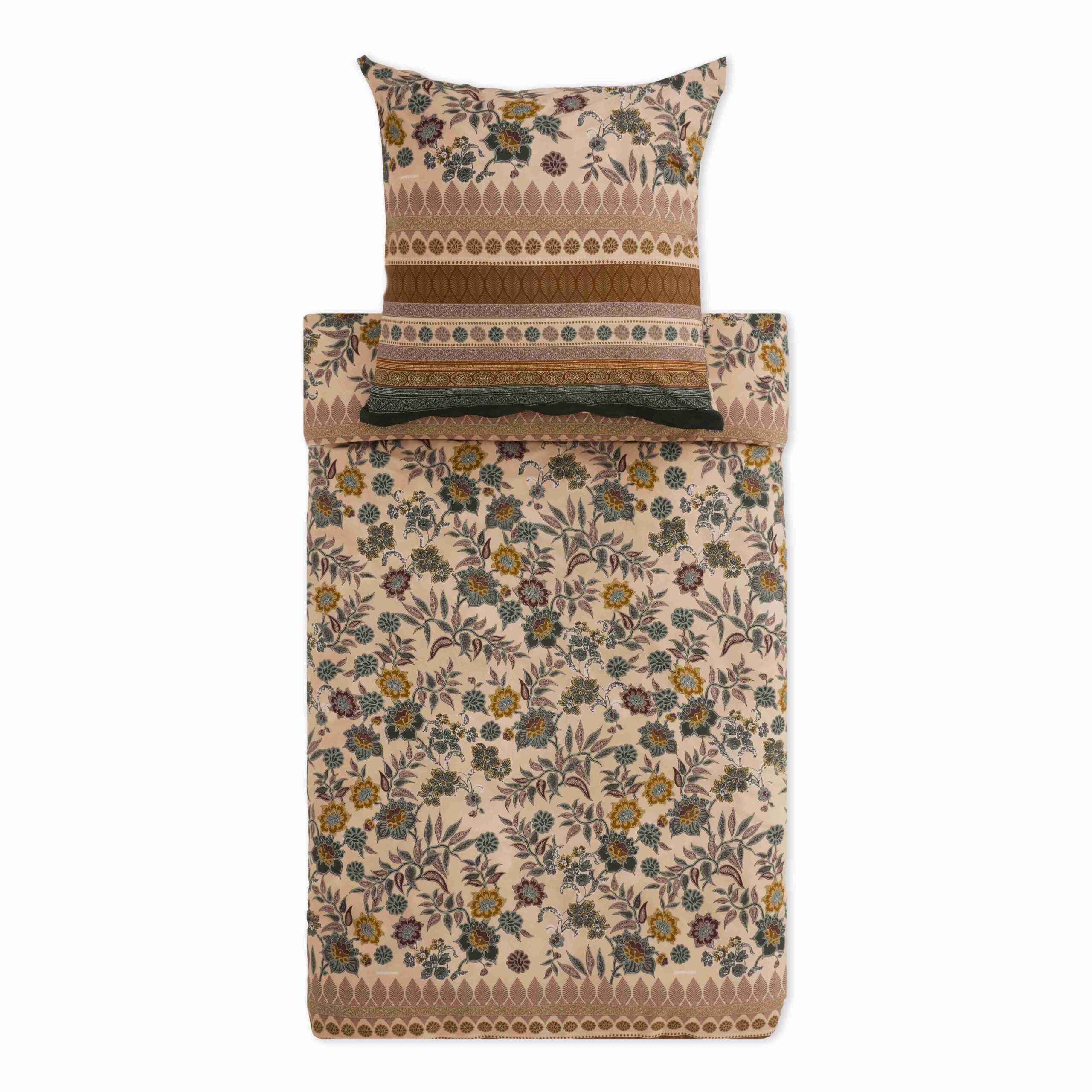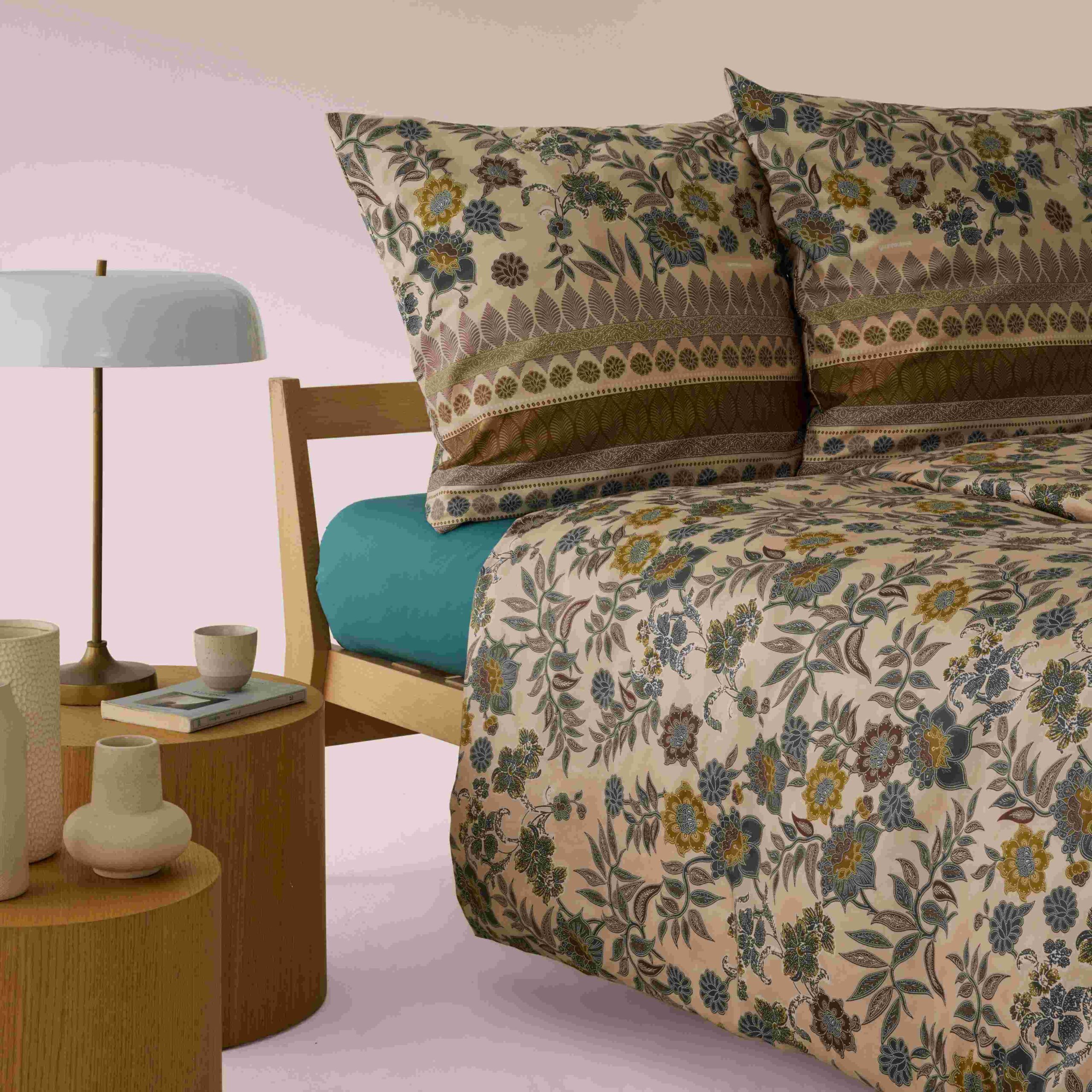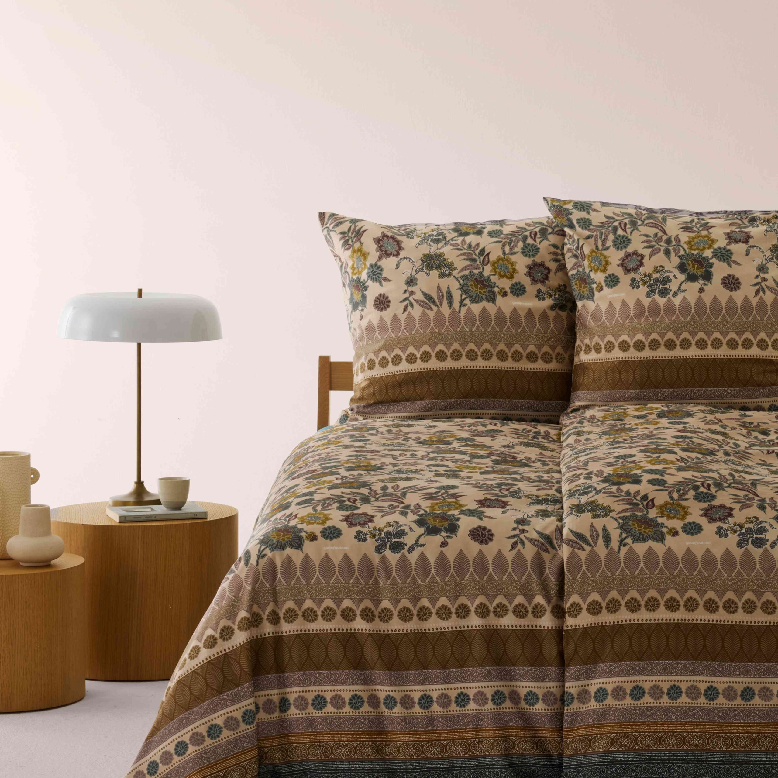 Die Bassetti Bettwäsche Varigotti V1: Das Varigotti Duvet Cover Set vV1 in der Farbvariante Natural von Granfoulard Bassetti Dessins verkörpert die ruhige, erdverbundene Seele der Riviera Revival Kollektion. Inspiriert von den Pallanca-Gärten in Bordighera interpretiert das Varigotti Dessin botanische Fülle in einer sanften, lichtdurchfluteten Farbwelt aus Sand, Salbeigrün und warmen Goldnuancen. In dieser Natural-Version wirkt das Varigotti Design besonders harmonisch und ausgewogen. Das in Batik-Technik gezeichnete Blumenmuster erscheint weich modelliert, fast wie von der Sonne ausgeblichen. Die exotischen Blüten und feinen Ranken entfalten sich dezent auf dem Untergrund und erzeugen eine Atmosphäre von Gelassenheit und natürlicher Eleganz. Die elegante Volant-Bordüre mit ihren geometrischen und naturinspirierten Formen strukturiert das Gesamtbild subtil und unterstreicht den hochwertigen Charakter des Varigotti Duvet Cover Sets vV1 von Bassetti Dessin. Das Varigotti Duvet Cover Set vV1 von Bassetti in Natural steht für RE-STORE im Sinne der Kollektion: eine Rückbesinnung auf Authentizität, Handwerkskunst und textile Tradition. Granfoulard Bassetti verbindet hier klassisches Ornament mit einer modernen, reduzierten Farbinterpretation. Diese Farbvariante vV1 des Varigotti Dessins eignet sich ideal für Interieurs, die auf Natürlichkeit, Leichtigkeit und zeitlose Eleganz setzen. Das Zusammenspiel aus floraler Opulenz und ruhiger Farbgebung schafft ein Schlafzimmerambiente, das an einen mediterranen Sonnenuntergang erinnert – sanft, einhüllend und voller Harmonie.