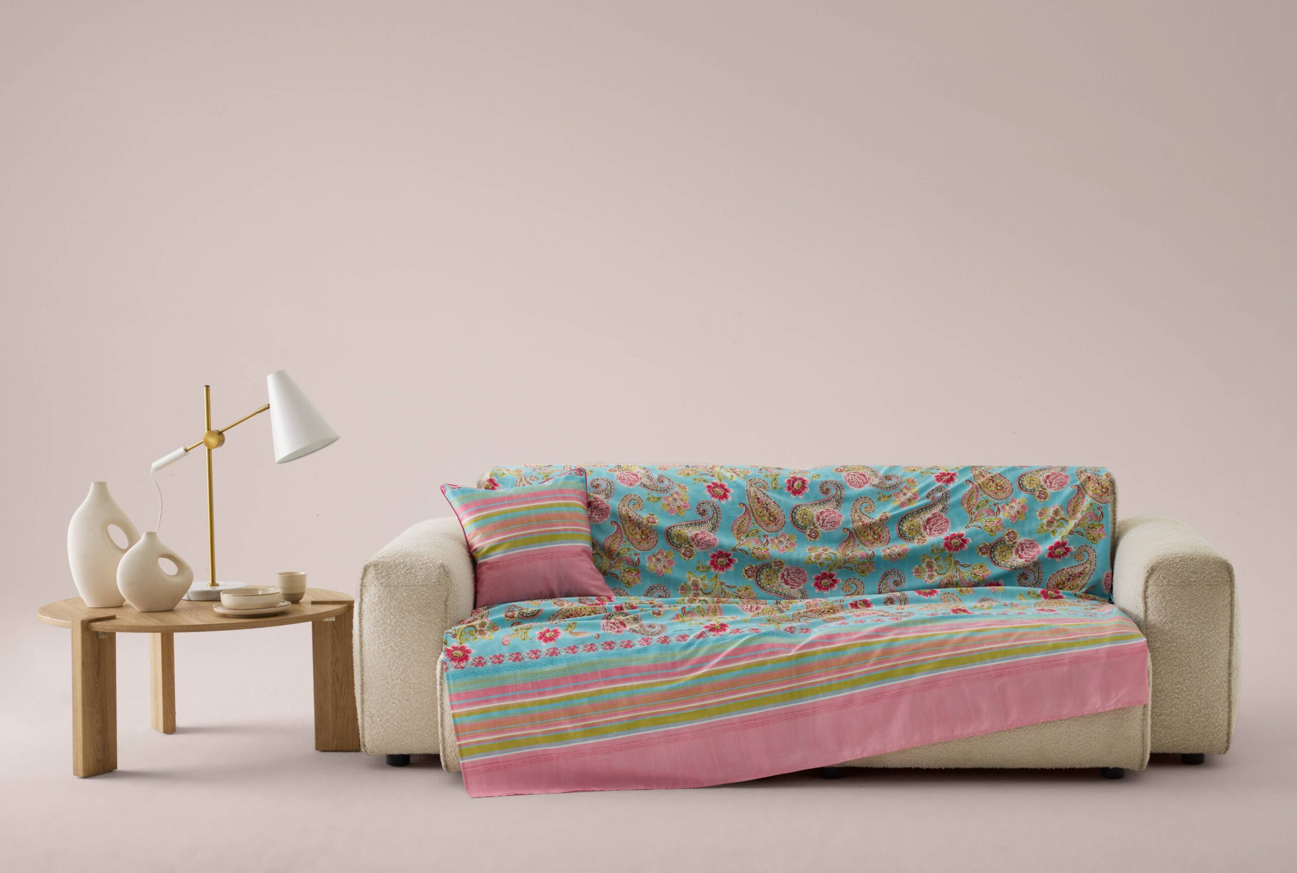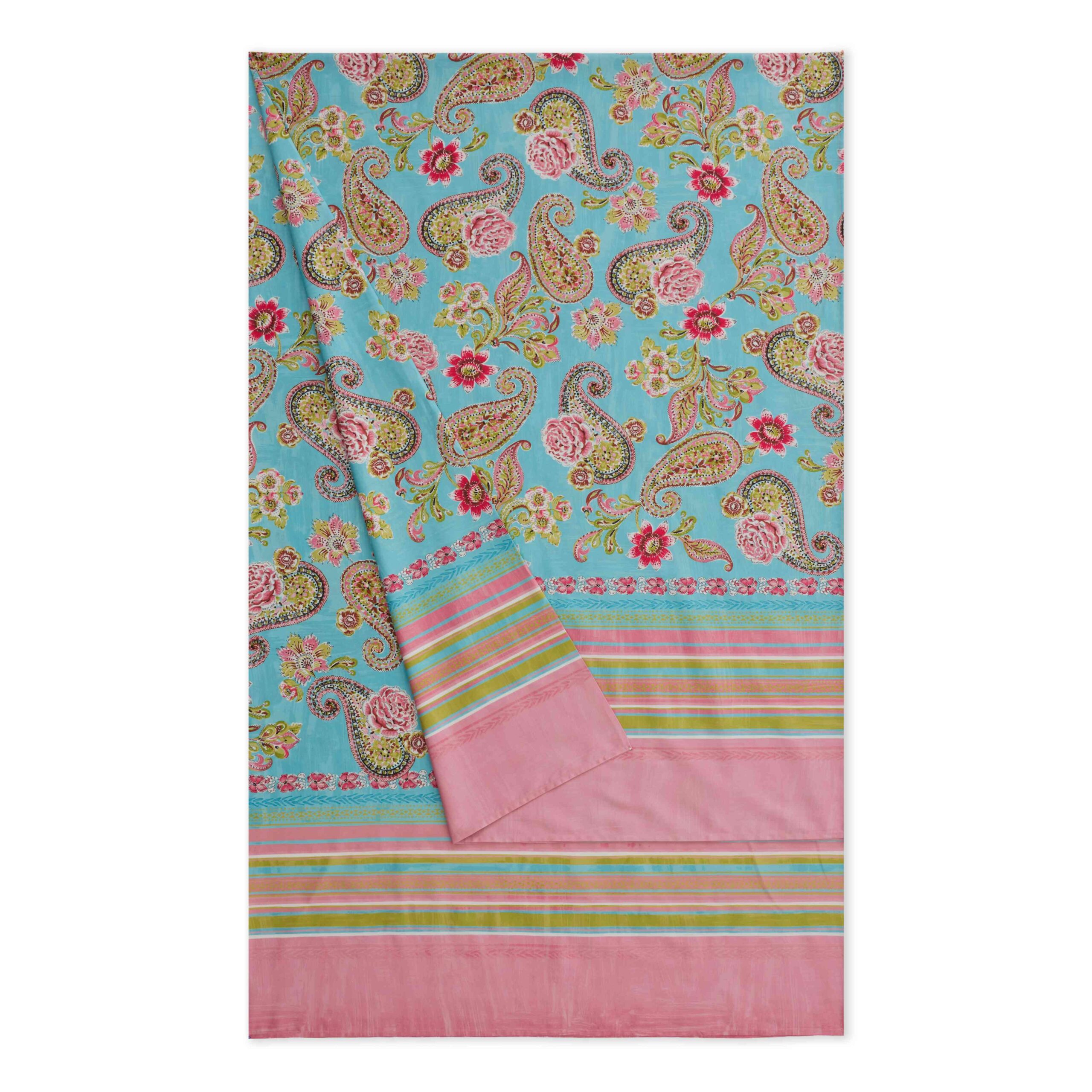 Die Bassetti Foulard Rapallo T1: Bringen Sie frische und lebendige Farbakzente in Ihr Zuhause mit diesem dekorativen Einrichtungsfoulard und der passenden Kissenhülle. Das verspielte Paisley- und Blumenmuster auf einem strahlenden Türkiston wird durch harmonische Streifen in Rosa, Pink, Grün und Gelb ergänzt und sorgt für eine freundliche, sommerliche Ausstrahlung. Die detailreichen Ornamente verleihen dem Design eine elegante und zugleich moderne Note. Gefertigt aus 100 % reiner Baumwolle, überzeugt das Material durch seine weiche Haptik sowie seine hautfreundlichen und atmungsaktiven Eigenschaften. Die hochwertigen Druckfarben sorgen für eine langanhaltende Farbbrillanz und machen das Foulard zu einem langlebigen Wohnaccessoire. Ob als Überwurf für Sofa oder Bett, als leichte Tagesdecke oder als dekorativer Blickfang – dieses vielseitige Wohntextil bringt Farbe, Leichtigkeit und stilvolle Gemütlichkeit in jeden Wohnraum. Ein echtes Highlight für ein modernes Wohnambiente.