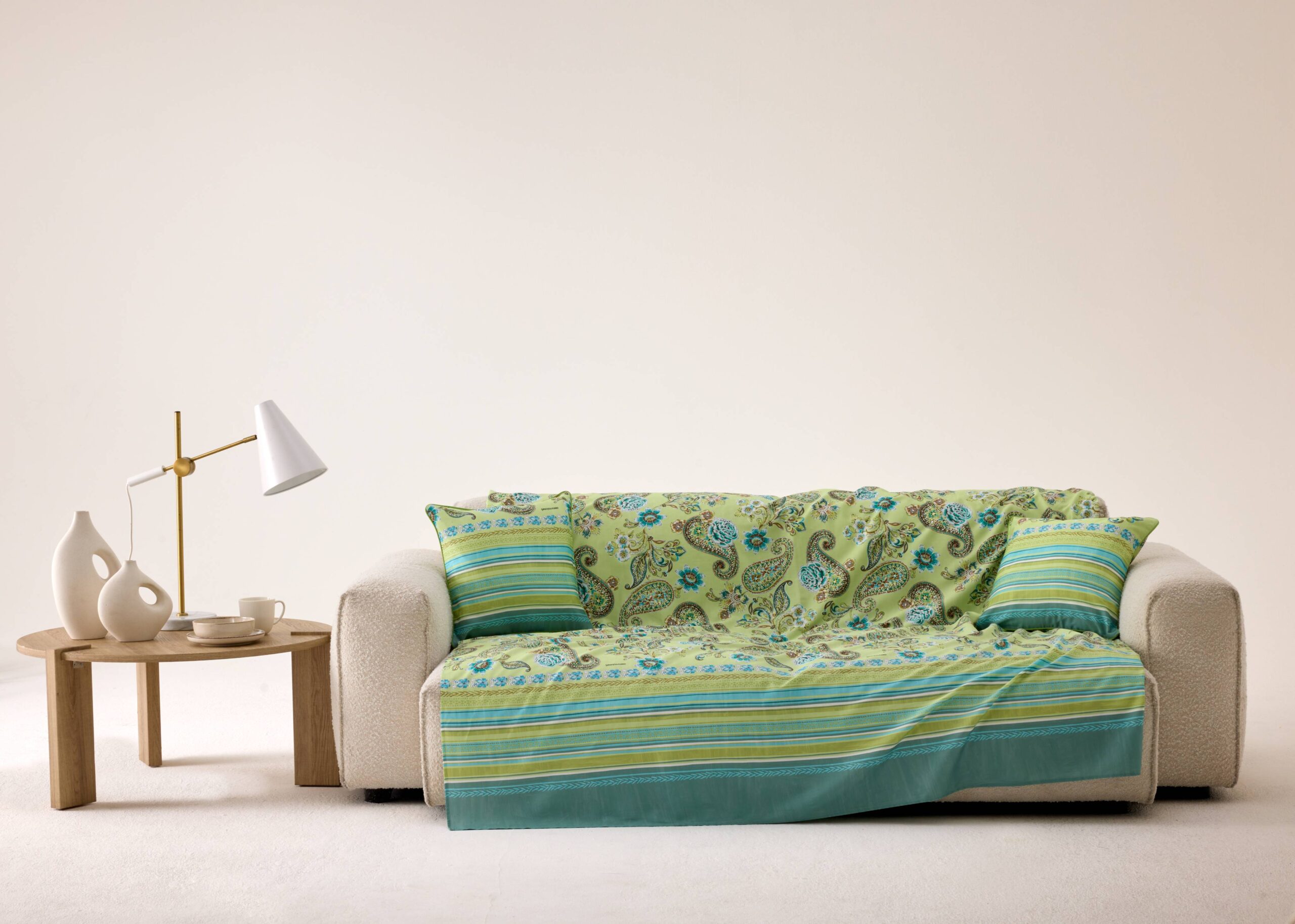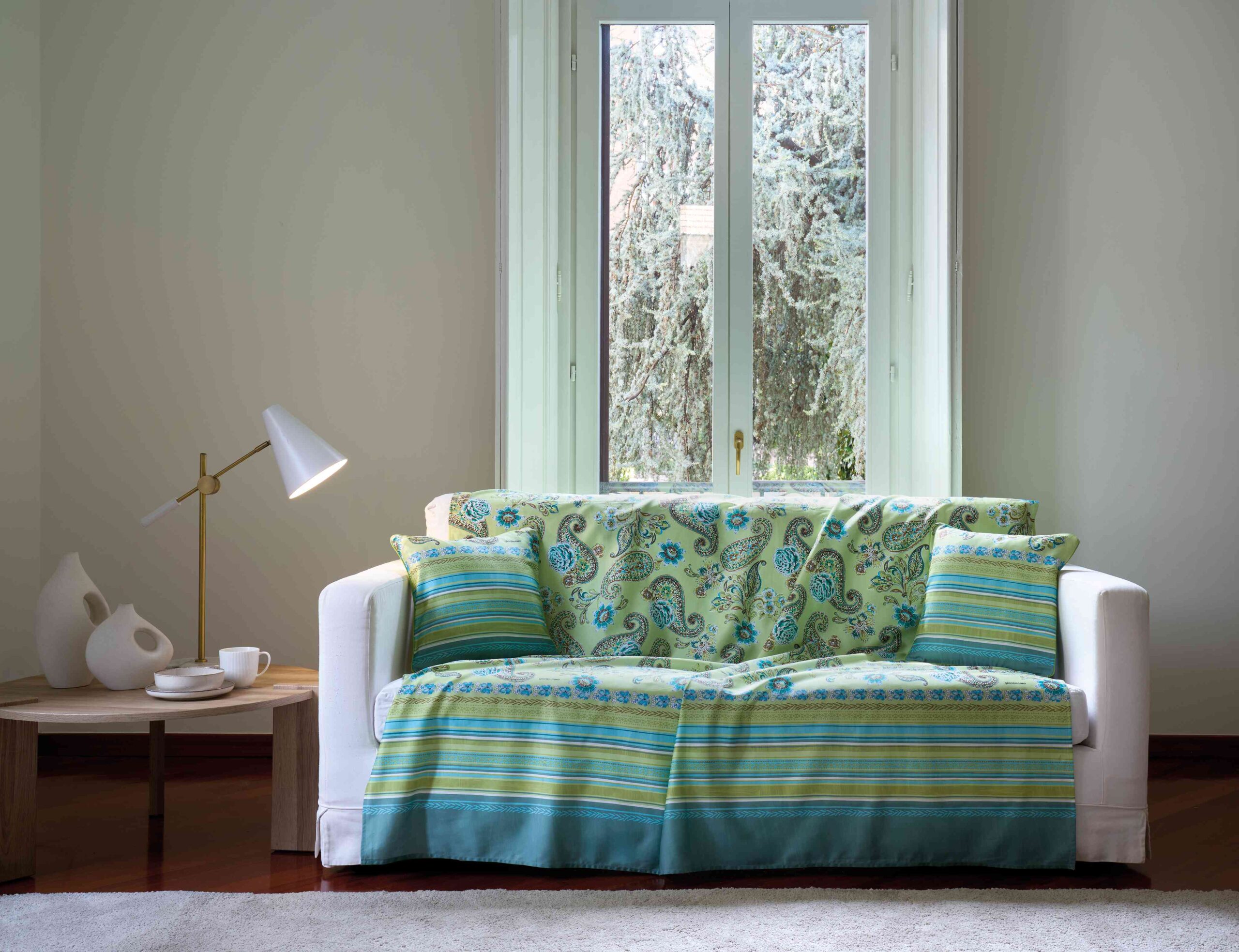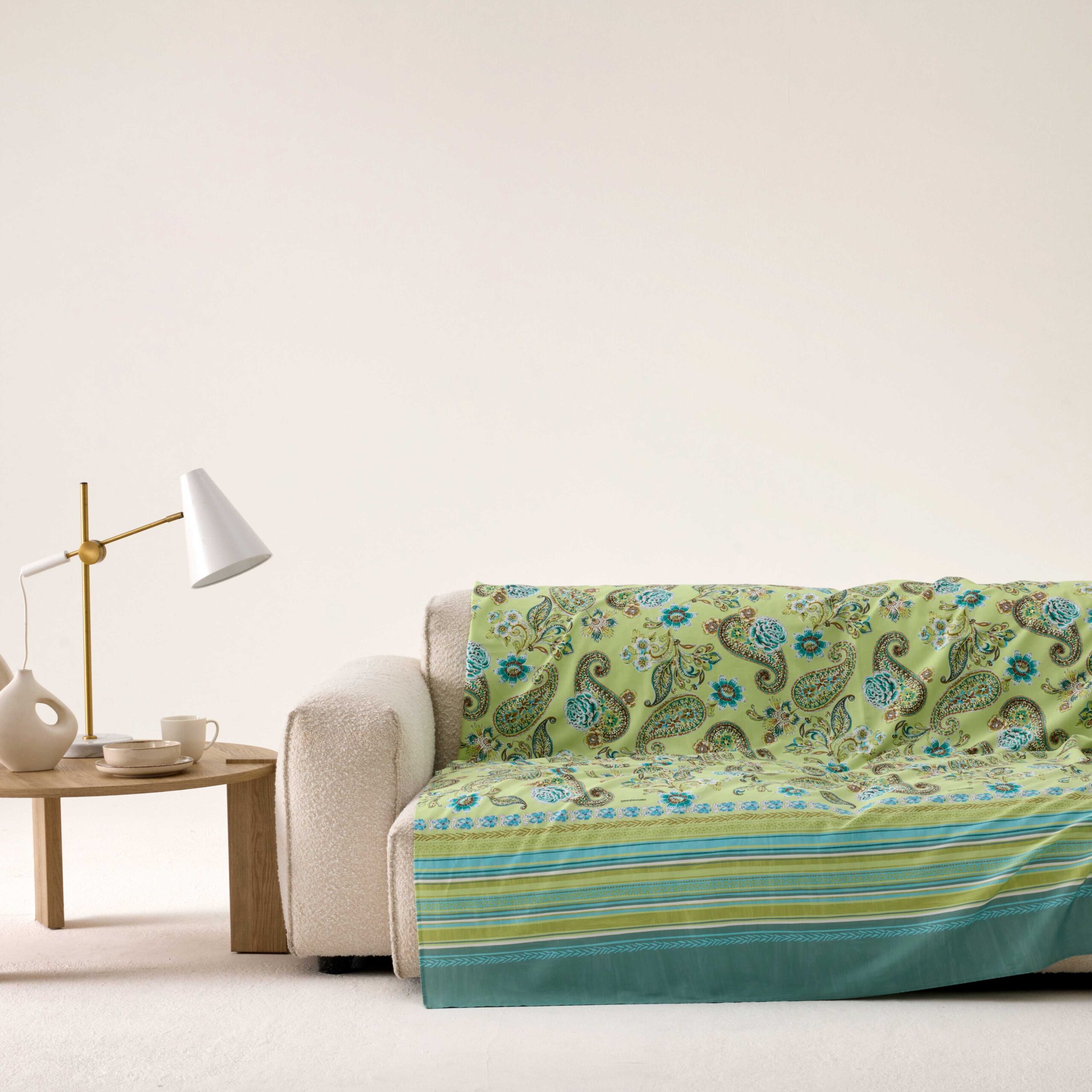 Die Bassetti Foulard Rapallo V1: Setzen Sie frische Akzente in Ihrem Zuhause mit unserem eleganten Einrichtungsfoulard und der passenden Kissenhülle. Das lebendige Paisley-Muster, handgemalt in Grün als dominierende Farbe, kombiniert harmonisch Türkis, Petrol und Aqua, die an sanfte Meereswellen und sommerliches Blattgrün erinnern. Gefertigt aus 100 % reiner Baumwolle, überzeugt das Material durch weiche Haptik und natürliche Atmungsaktivität. Die sorgfältig ausgewählten Druckfarben halten die Leuchtkraft und Frische des Designs lange erhalten. In Italien hergestellt, spiegelt das Foulard feines italienisches Stilbewusstsein wider. Vielseitig einsetzbar, verschönert es Sofa oder Bett, dient als Tagesdecke oder wird zum dekorativen Accessoire. Ein frischer, sommerlicher Blickfang, der jedem Raum sofort Leichtigkeit verleiht.