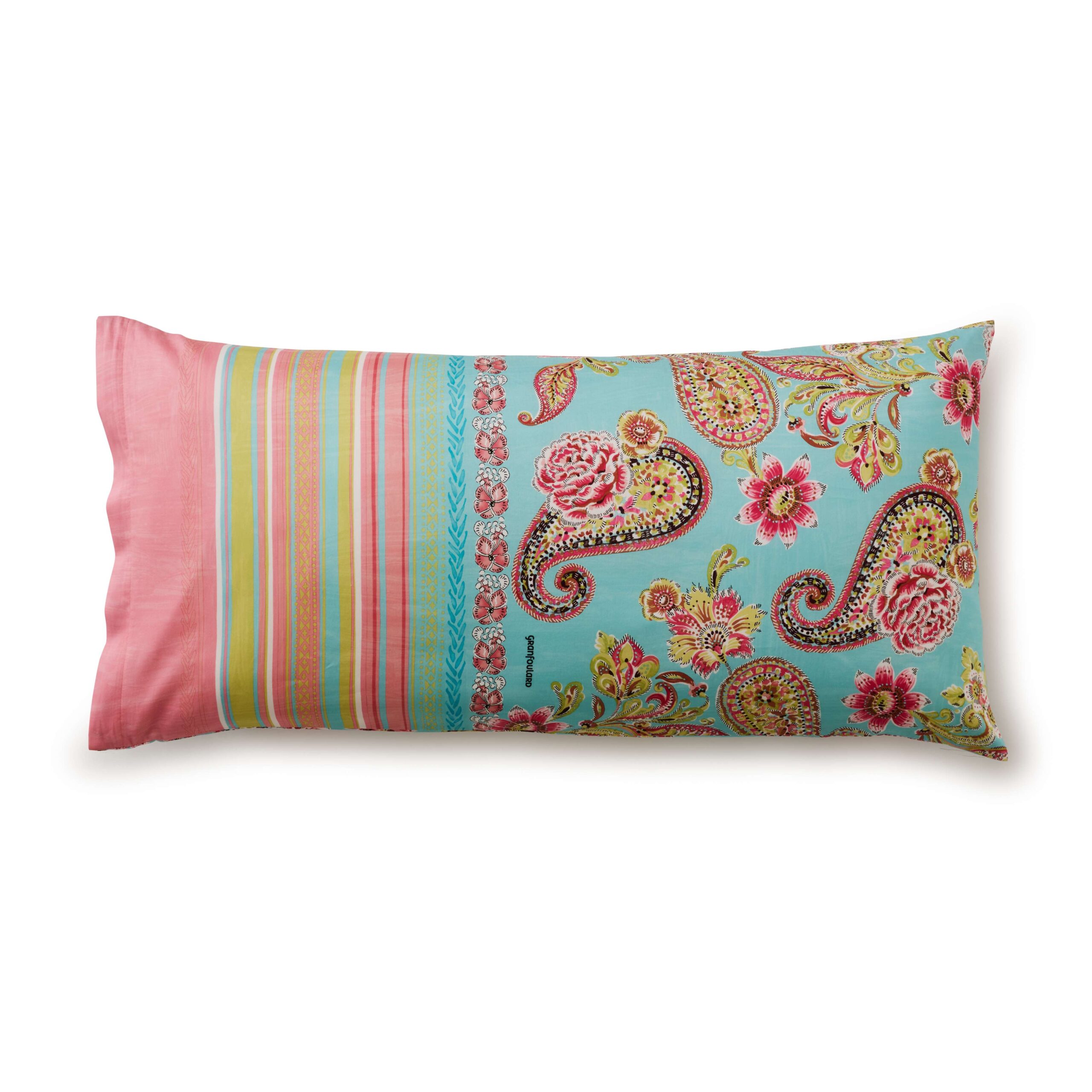Die Bassetti Kissenhülle Rapallo T1: Tauchen Sie ein in den sommerlichen Charme Italiens mit dieser Kissenhülle aus 100 % Baumwolle, gefertigt in Italien. Das Design verbindet filigrane, handgezeichnete Blumenmotive mit geschwungenen Paisley-Elementen, die wie mit Aquarellfarben sanft auf die Hülle getupft wirken. Kräftige Türkistöne bilden das Herzstück des Musters, während zarte Fuchsia- und Kiwi-Akzente die Komposition lebendig und frisch erscheinen lassen. Inspiriert von den farbenfrohen Stränden der italienischen Küste, erinnert die Hülle an das Spiel von Sonne, Meer und sommerlichen Blüten. Zwei harmonisch aufeinander abgestimmte Muster – eines mit zentralen Blumenornamenten, eines in sanften Pastelltönen – verleihen jedem Raum einen eleganten, mediterranen Touch. Perfekt, um Sofa oder Bett eine frische, sonnige Note zu verleihen, vereint diese Kissenhülle italienisches Design, hochwertige Materialien und sommerliche Lebensfreude.