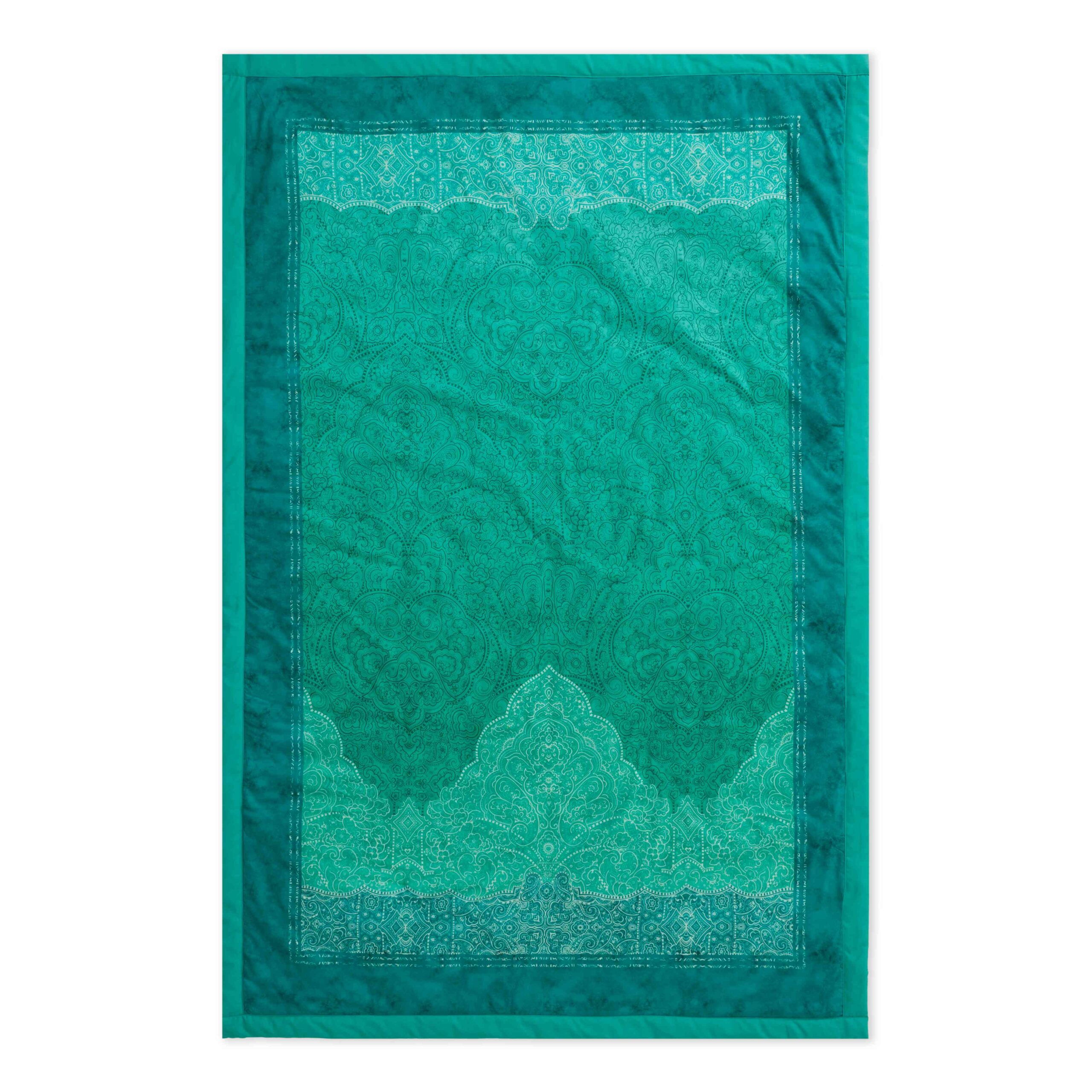 Die Bassetti Plaid Dolceacqua V1: Das Dolceacqua Plaid vV1 von Granfoulard Bassetti beeindruckt durch die feine Verbindung von klassischer Ornamentik und frischer, natürlicher Farbgestaltung. Die sanften Übergänge von Salbeigrün zu sattem Smaragd schaffen eine harmonische Tiefe, die an die üppigen mediterranen Gärten erinnert, welche das Dessin von Bassetti inspirieren. Das fließende Paisley-Muster des Dolceacqua vV1 Plaid verschmilzt organisch mit dem Farbverlauf, wodurch eine lebendige und zugleich beruhigende Oberfläche entsteht. Die geschwungenen Voluten wirken weich, filigran und dennoch präzise ausgearbeitet. Der klare, helle Volant setzt einen leuchtenden Rahmen und verleiht dem Plaid Dolceacqua vV1 von Bassetti eine elegante Kontur. Als vielseitiges Wohnaccessoire bringt das Dolceacqua Plaid vV1 frische Natürlichkeit und zeitlose Eleganz in jedes Interieur. Ob als Überwurf auf Sofa oder Bett – es vermittelt eine Atmosphäre von mediterraner Ruhe und stilvollem Komfort, die typisch für Granfoulard Bassetti ist.