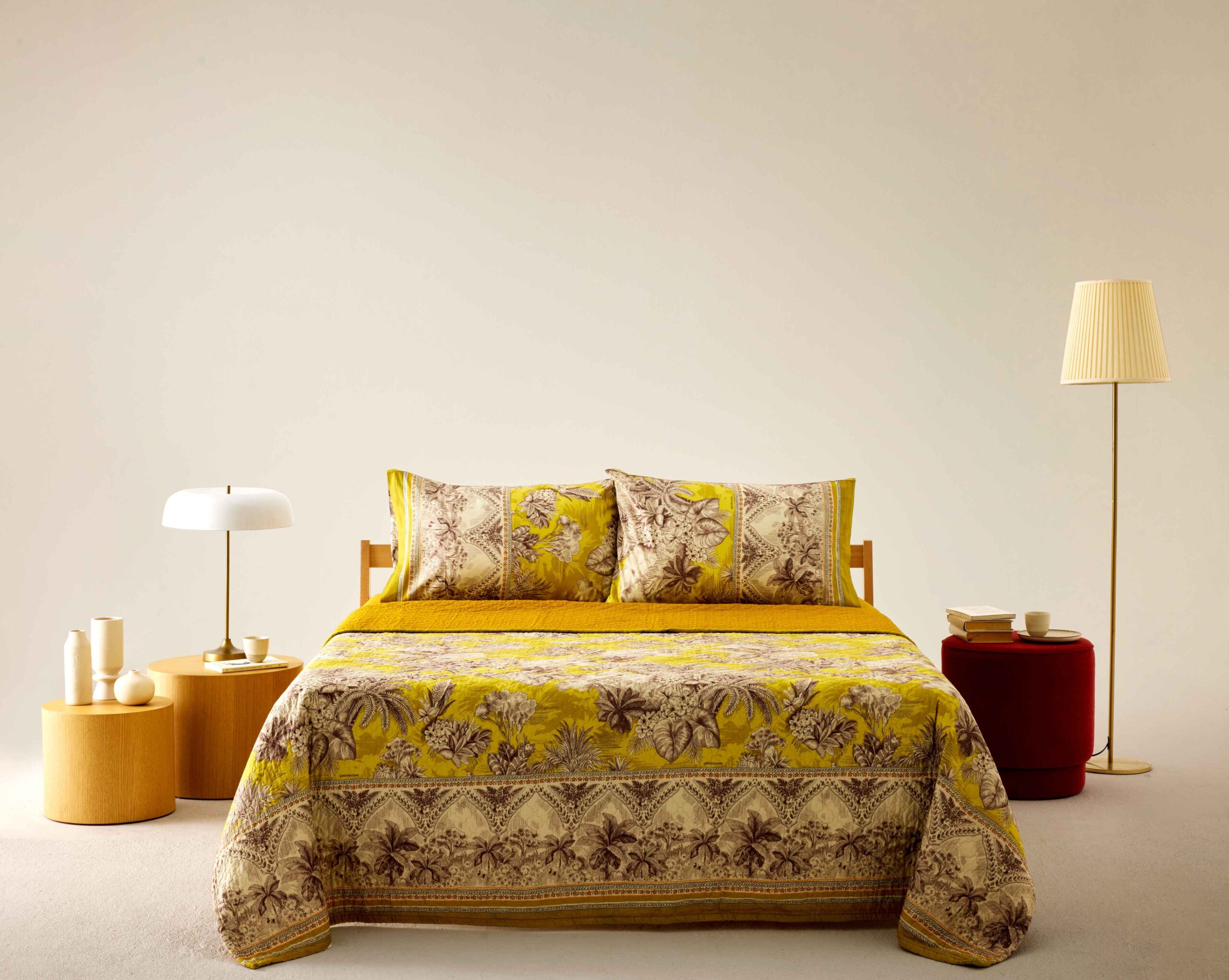 Bringen Sie das Gold des Südens in Ihre vier Wände. Die Bassetti Tagesdecke Boboli Y1 und die passenden Accessoires des Dessins Boboli wirken in der Farbstellung Y1 wie ein eingefangener Sonnenstrahl. Durch die hochwertige Steppung erhalten die sepiafarbenen Palmenmotive eine faszinierende Plastizität, die an historische Kupferstiche aus botanischen Archiven erinnert. Als Einrichtungsstoff oder Kissenhülle setzt Boboli mutige, vitale Akzente: Das Zusammenspiel aus der Energie des Zitronengelbs und der Erdigkeit der Sepia-Töne schafft eine Atmosphäre, die gleichzeitig anregend und luxuriös wirkt. Diese Textilien sind mehr als nur Dekoration – sie sind ein Statement für einen exklusiven, weltoffenen Lebensstil. Ob als großzügiger Überwurf oder als punktueller Blickfang auf dem Sofa: die Tagesdecke Boboli Y1 füllt den Raum mit einer Wärme, die auch an grauen Tagen das Gefühl einer strahlenden, mediterranen Parkanlage heraufbeschwört.