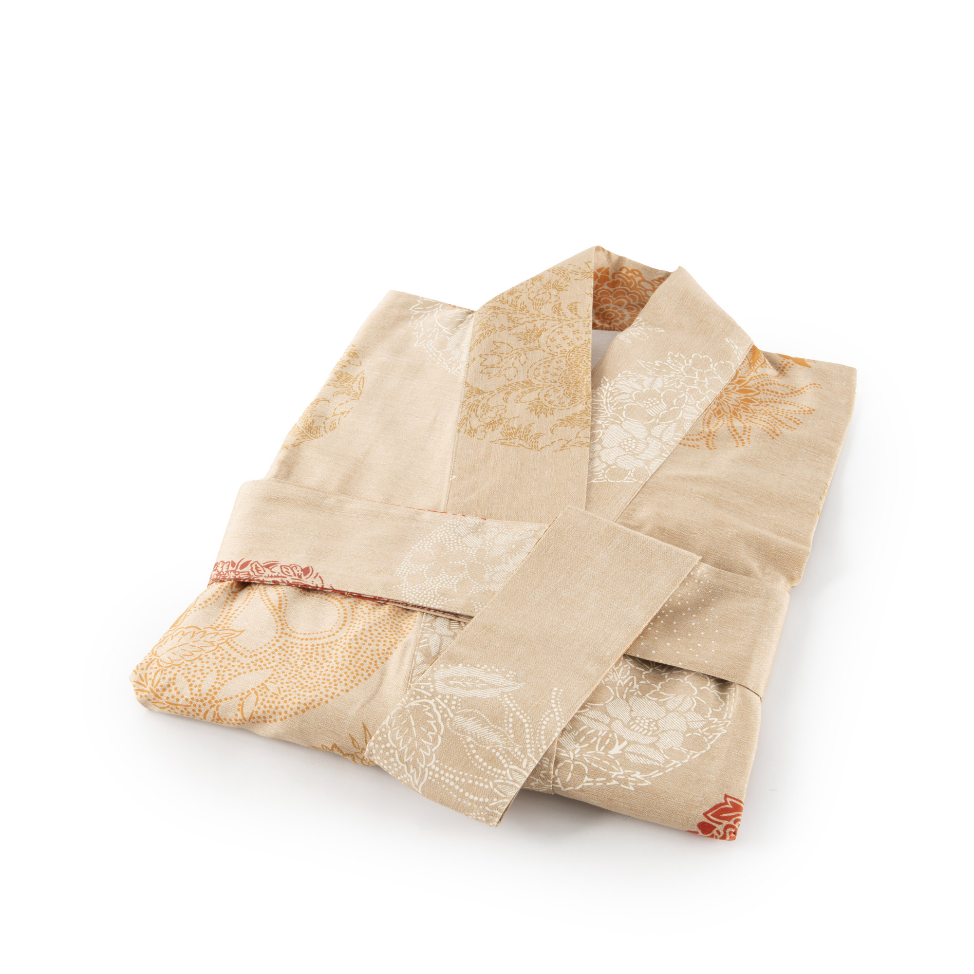 Die warme, natürliche Farbkomposition des Kimono Florence R1 von Bassetti aus Beige, Gold und Kardinalrot wirkt edel und zurückhaltend. Zwei zarte Borten mit goldfarbenem Abschluss verleihen dem Schnitt klare Linienführung und ruhige Eleganz.