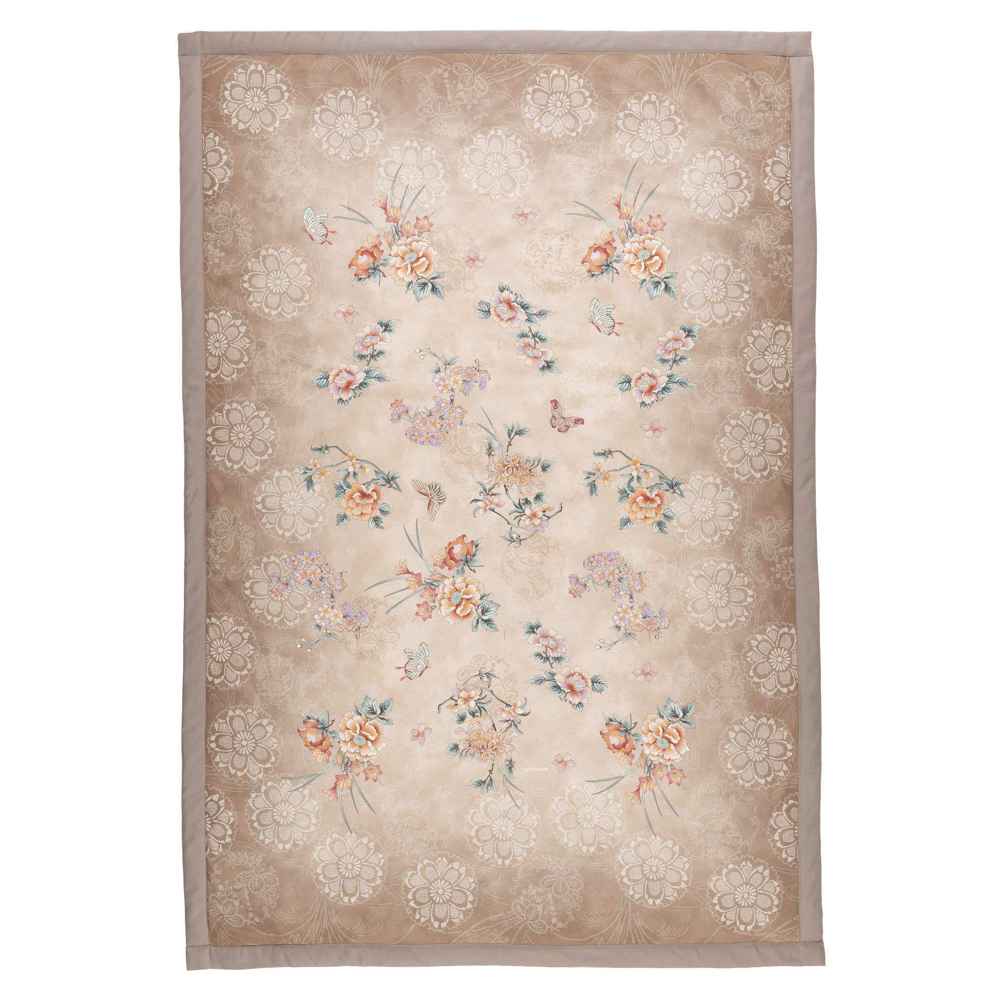 Das von antiken Obi-Gürteln inspirierte Designrahmen bildet eine elegante Struktur, während Schmetterlinge und florale Bouquets eine romantische Leichtigkeit vermitteln. Ob auf dem Sofa, als Tagesdecke oder über den Lieblingssessel gelegt – dieses Plaid Esperidi 41 von Bassetti verwandelt jeden Raum in einen Ort der Stille und Harmonie.