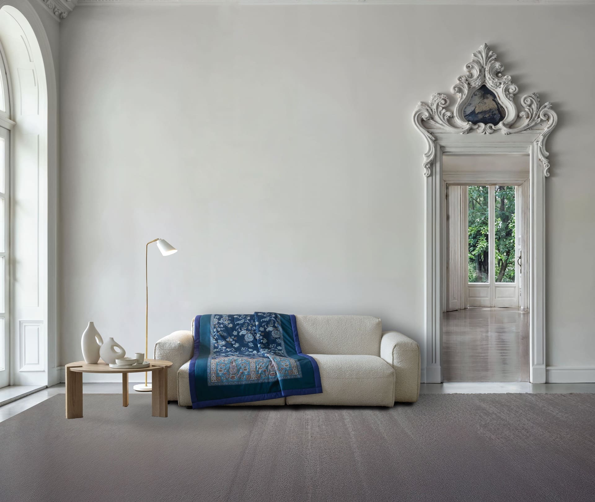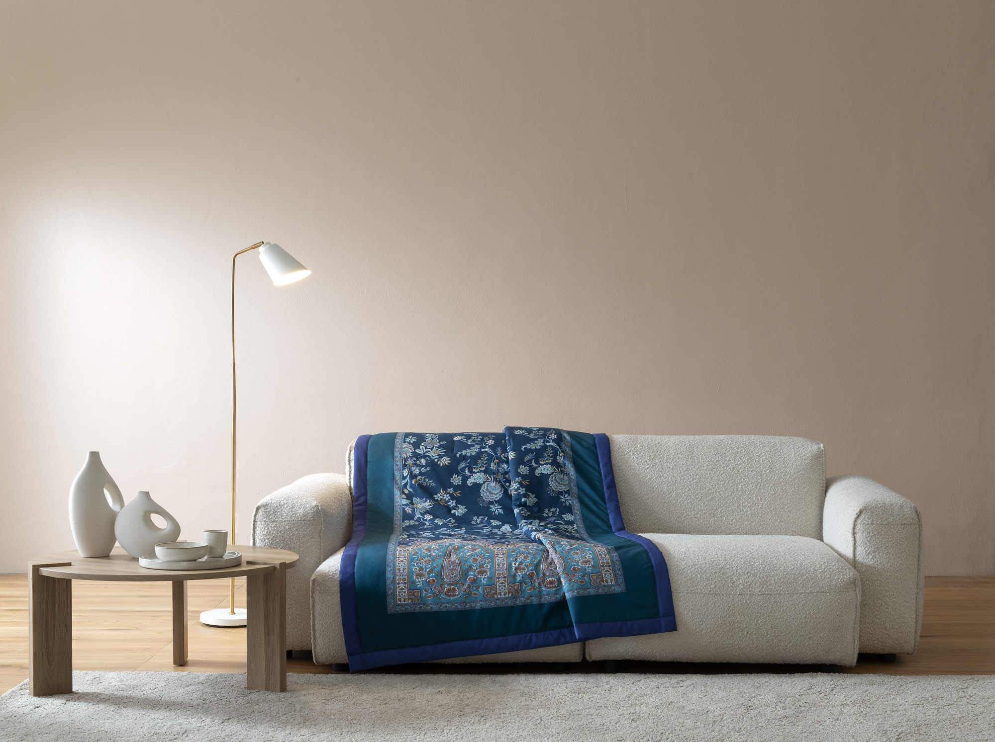 Die Farbtöne Blau, Avio und Cognac des Plaid Indian Roses B2 von Bassetti sorgen für eine kultivierte Frische, die dennoch Wärme und Geborgenheit vermittelt.