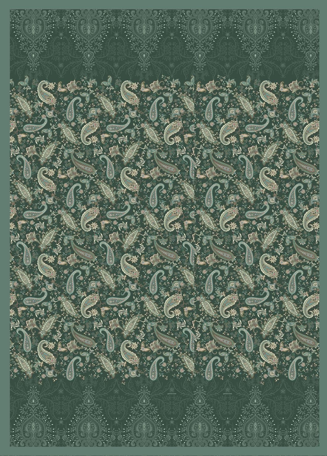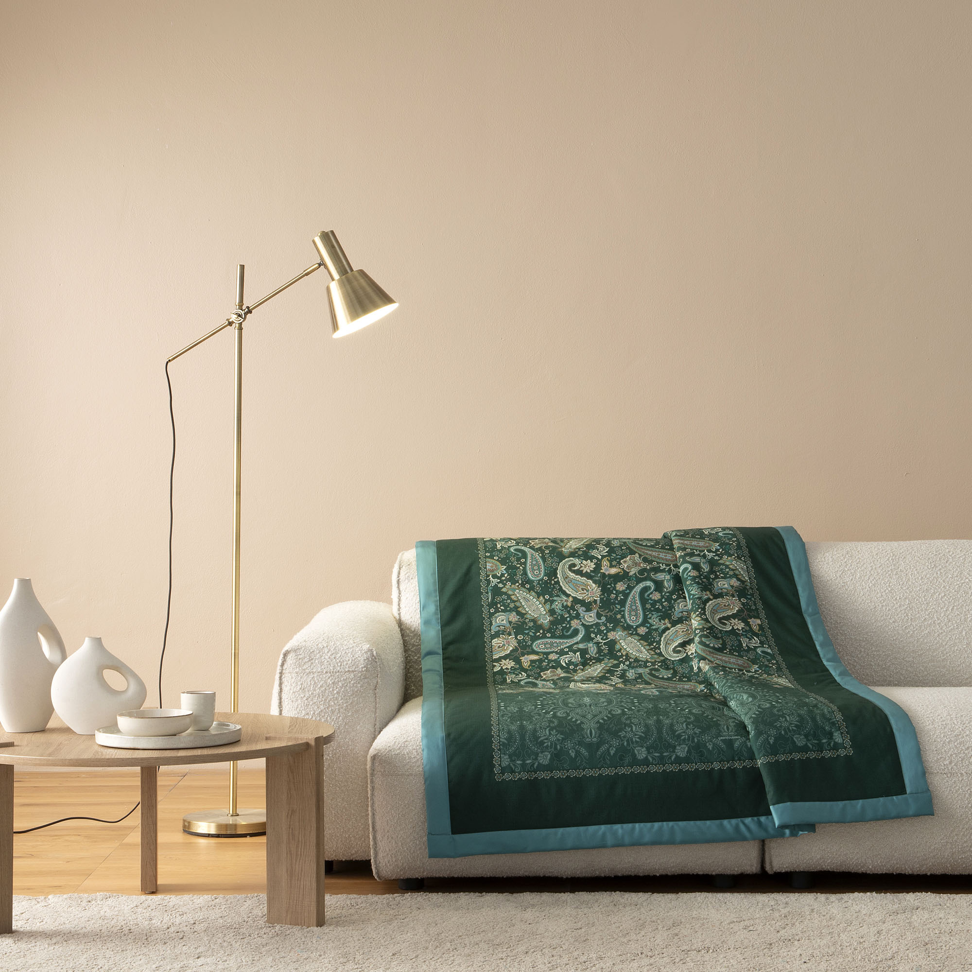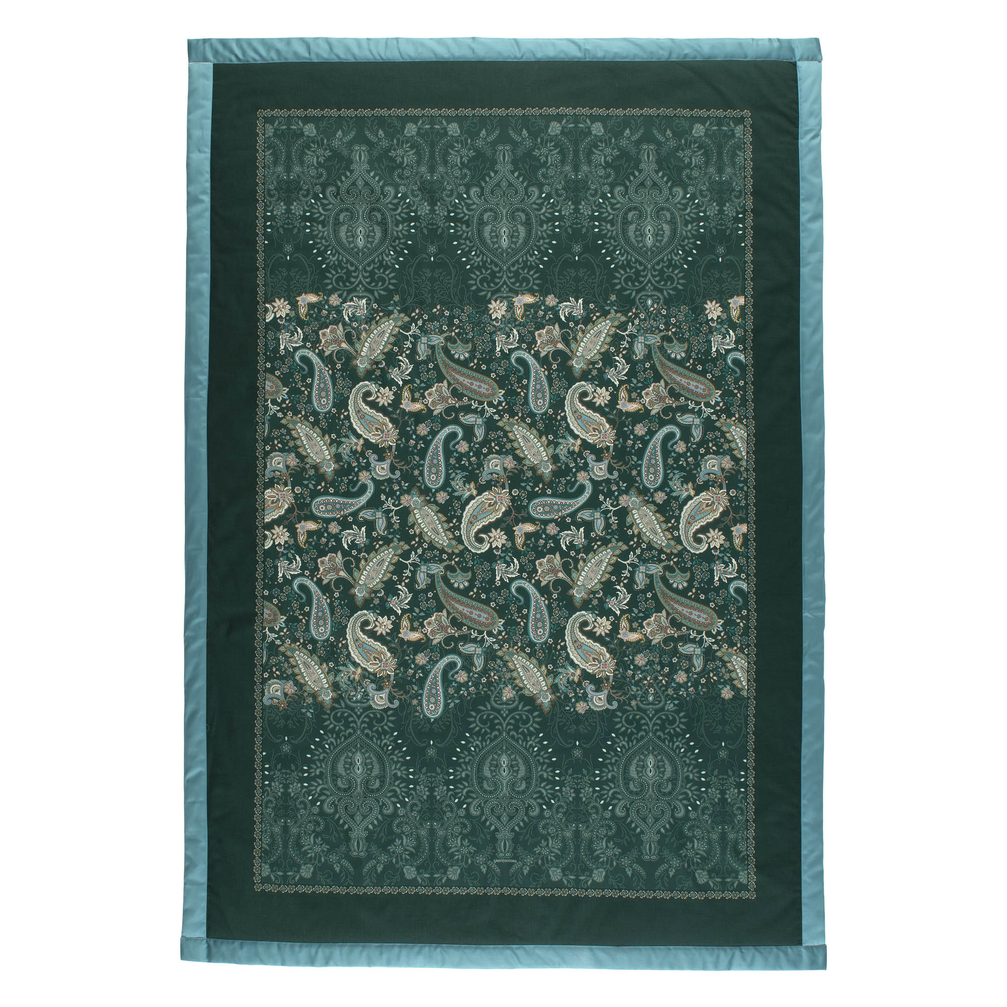Inspiriert von den grünen Gärten der Toskana bringt das Bassetti Plaid Monnalisa V1 beruhigende Farbwelten und kunstvolle Raffinesse in Ihr Zuhause. Das Plaid Monnalisa V1 zeigt ein fein gearbeitetes Paisley-Muster in Kiefern-Grün, Türkis und Moos, das durch eine subtile Borte in Cashmere-Optik abgerundet wird.