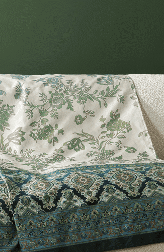Bassetti Foulard Agrigento V1 präsentiert sich in frischen Grünnuancen mit verspielten Blütenmotiven auf hellem Fond. Die fein ausgearbeiteten, ornamental gestalteten Bordüren verleihen dem Dessin eine elegante, leicht orientalische Note, die an üppige mediterrane Gartenlandschaften erinnert und moderne Wohnräume stilvoll, farbharmonisch und natürlich belebt.