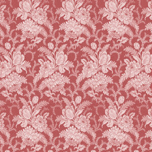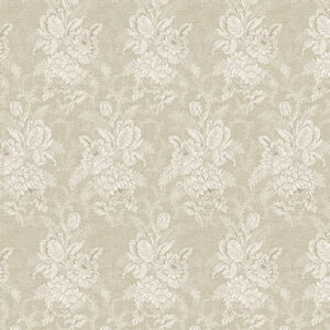 Der Mittelteil des Designs ist dezenter gehalten, während die angrenzende Bordüre dominanter gestaltet ist. Die Bordüre zeigt eine Blumenkomposition auf dunklem Grund, die mit raffinierten geometrischen und dekorativen Motiven verziert ist, die an traditionelle Posamente erinnern.