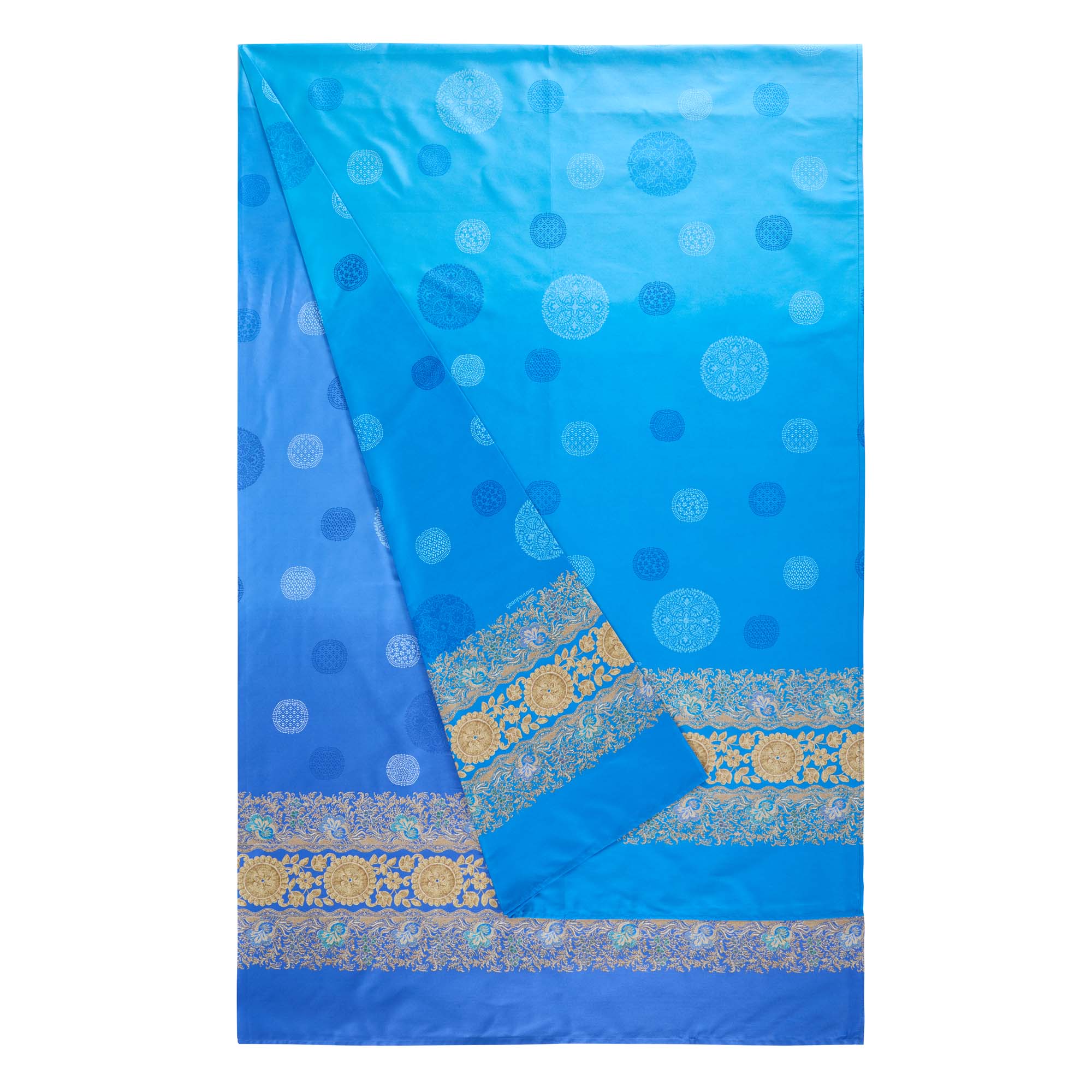 Die harmonische Farbkombination aus Kornblumenblau und Hellblau erinnert an den klaren Himmel und das schimmernde Wasser des Lago Maggiore und schafft eine beruhigende, dennoch ausdrucksstarke Atmosphäre. Der aufwendig gestaltete Volant kombiniert detailreiche Blütenmotive mit geometrischen Kreismustern im griechischen Stil, wodurch eine faszinierende Balance zwischen natürlicher Leichtigkeit und architektonischer Struktur entsteht.