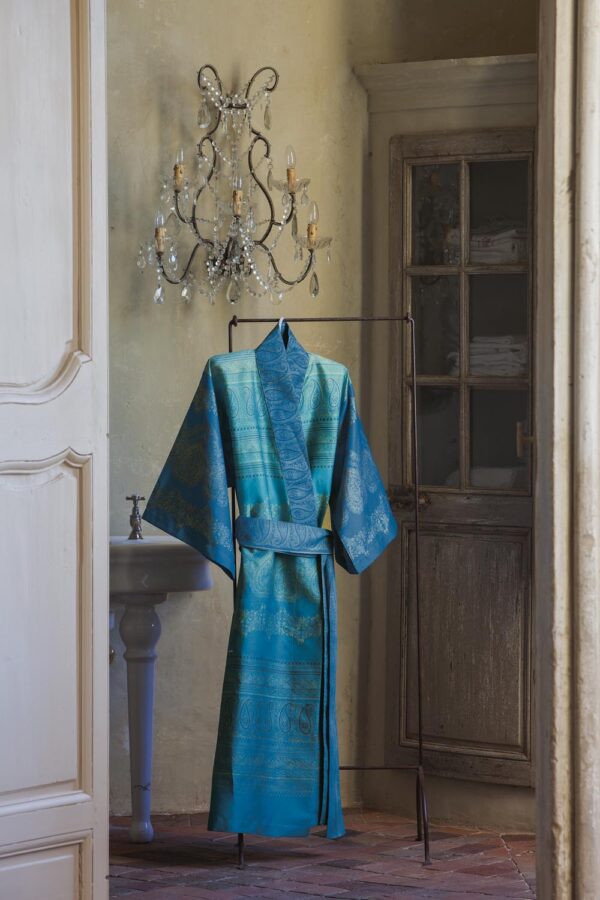 Der Bassetti Kimono Brunelleschi V2 von Bassetti spiegelt die Schönheit und Vielfalt des Meeres wider und verleiht ein mediterranes Flair bei angenehmen Tragegefühl. Im Fokus dieses Designs steht das vielfältige Muster aus den unterschiedlichsten Ornamenten und Verzierungen, wie einem Paisley-Motiv und anderen hochwertigen Akzenten, die in Reihen angeordnet sind und so perfekt zum Farbverlauf passen. Dieser Farbverlauf besteht aus den unterschiedlichsten Blautönen, die auch in der Farbe des Meeres wiederzufinden sind. Von einem starken Azurblau über ein leichtes Türkis bis hin zum kühlen Dunkelblau besticht der Kimono Brunelleschi V2 von Bassetti mit der Kombination aus dem Farbverlauf im Hintergrund, der durch die Ornamente und Verzierungen im Vordergrund abgerundet wird. Der Tragekomfort des Kimonos zaubert ein einzigartiges Wellness-Gefühl und schenkt einen Moment der Auszeit.