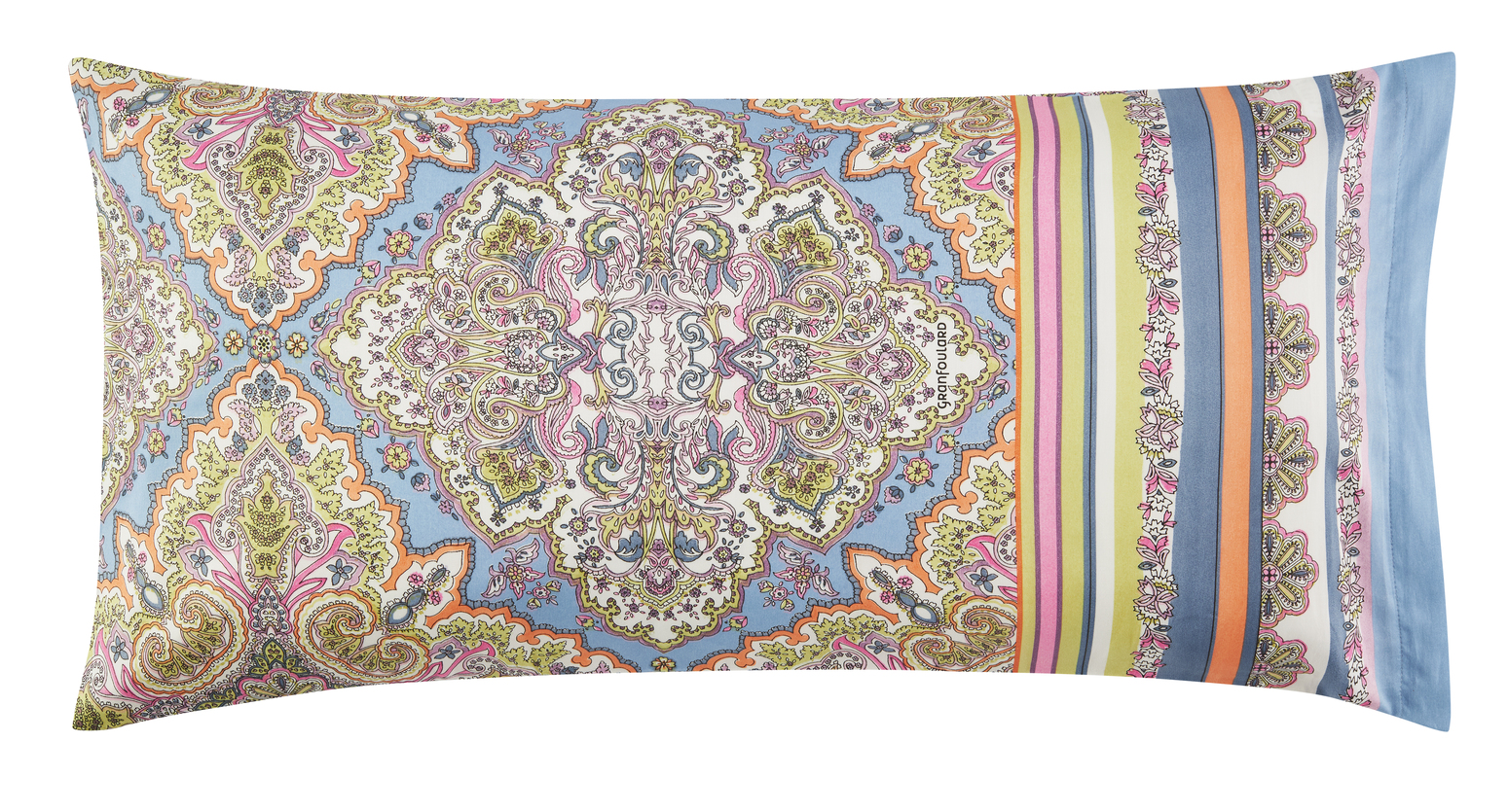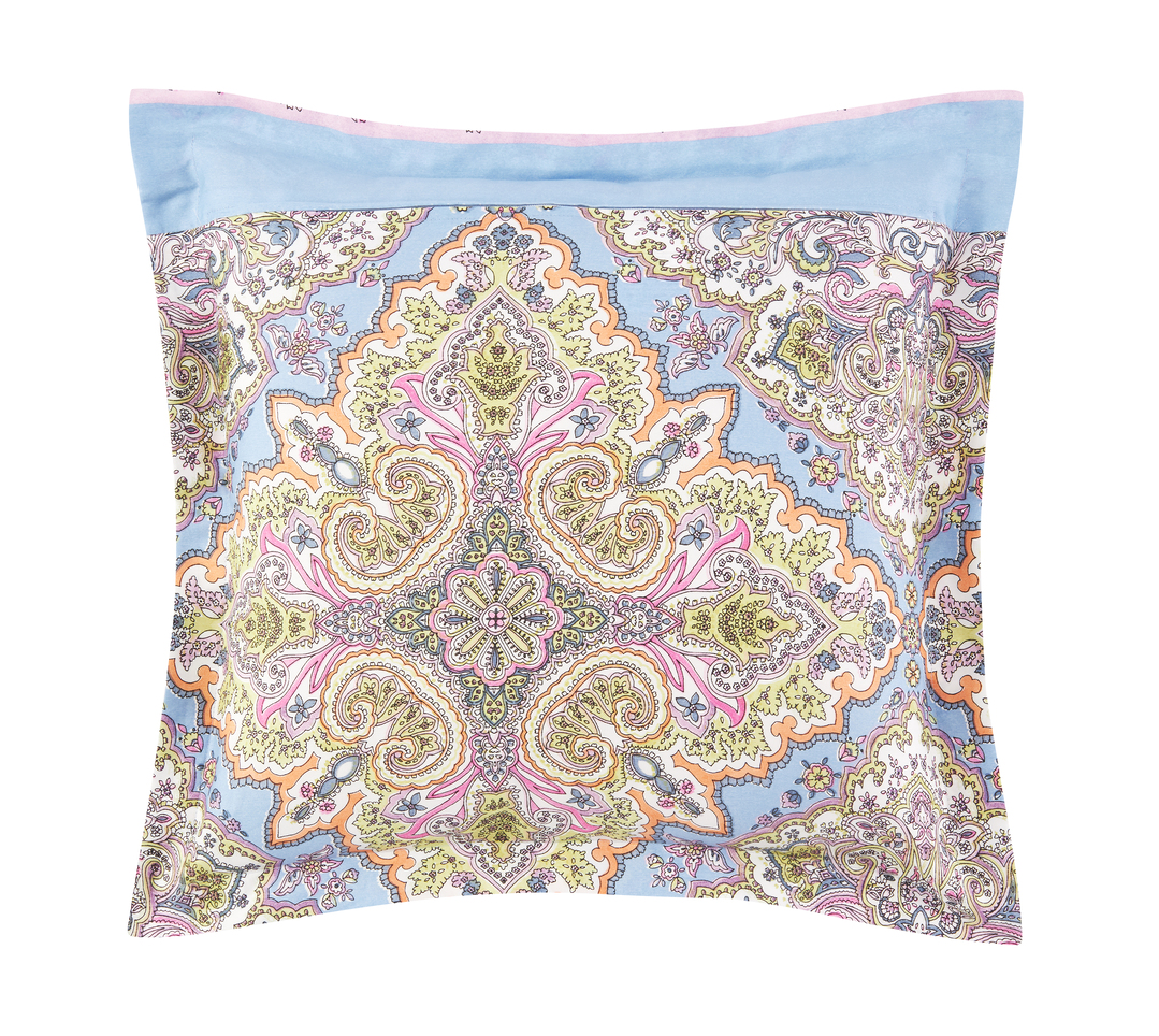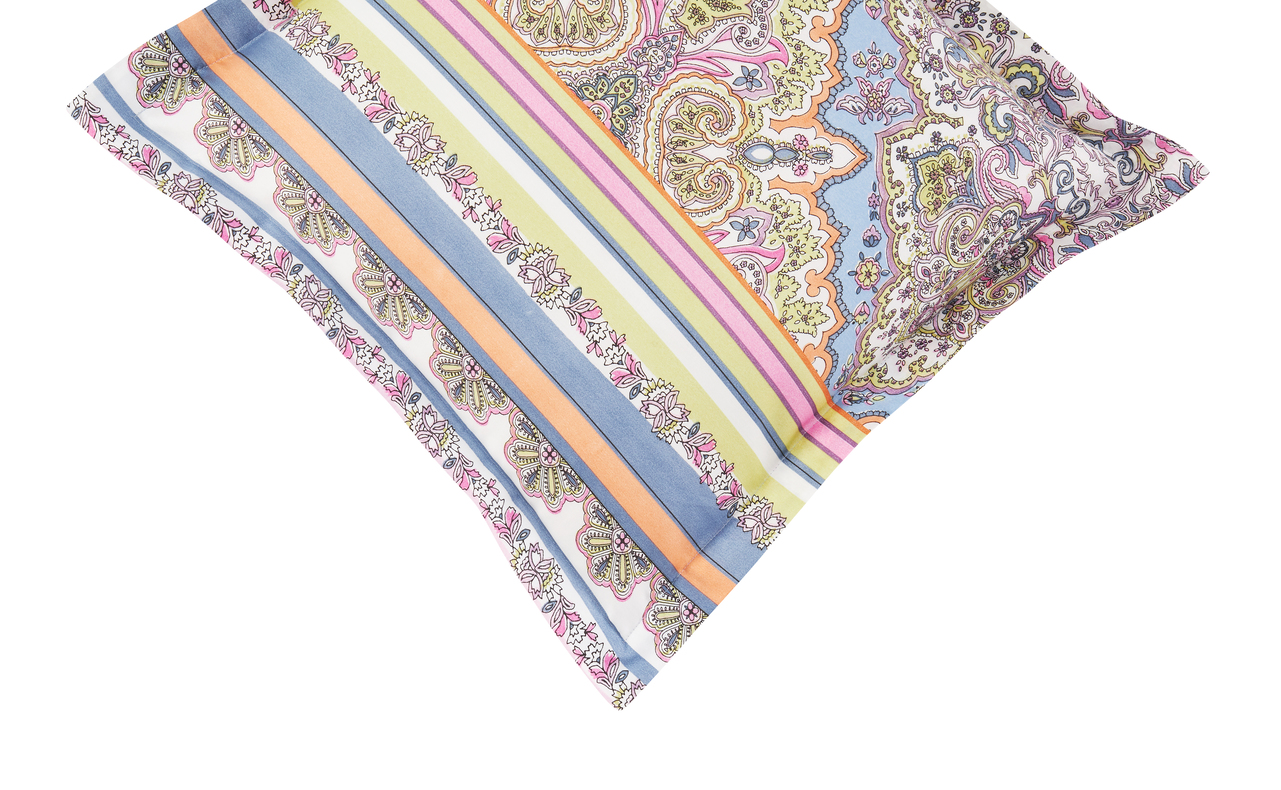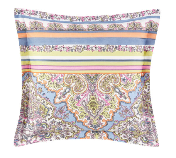 Hier präsentieren wir die Bassetti Kissenhülle Marechiaro L1. Die Kissenhülle hat einen bezaubernden Farbton. Es ist ein sehr chaotisches, dennoch geordnetes Muster. Die Farbwahl sehr ist sehr ausgeprägt es kommt Mediteranisches Orange vor Meer blau zartes gelb und ein Hauch von rosa und lila. Es ist eine durchmischte Farbpalette, die das ganze aber besonders macht. Das Muster ist symmetrisch zueinander und hat zwischen den einzelnen Farbstreifen noch andere kleinere, fein gearbeitete Muster. Auf der Hinterseite findet man ein sehr füllendes Muster.