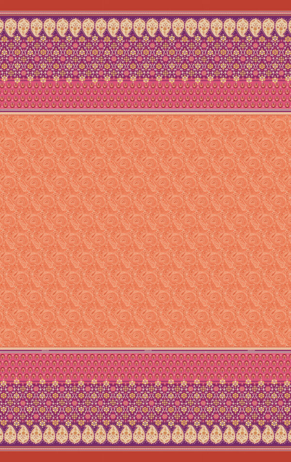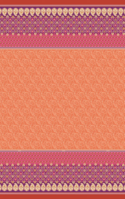 Beidseitig erheben sich Bordüren, die sich aus ineinander verflochtenen Verzierungen abstrakter Natur zusammenfügen. bassettis Granfoulard Laglio O1 verkörpert die voll bestückten Mandarinenbäume vor dem rötlichen Hintergrund des warmen Sommertages.