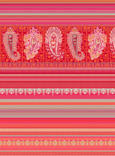 Das Mocenigo R1 Granfoulard als zweite Variante hingegen legt Wert auf einen strahlend-korallenfarbigen Eindruck. Als wäre das gesamte Dessin in leuchtendes Korallpastell eingetaucht worden sorgt es für einen besonders herzlich warmen Hingucker.