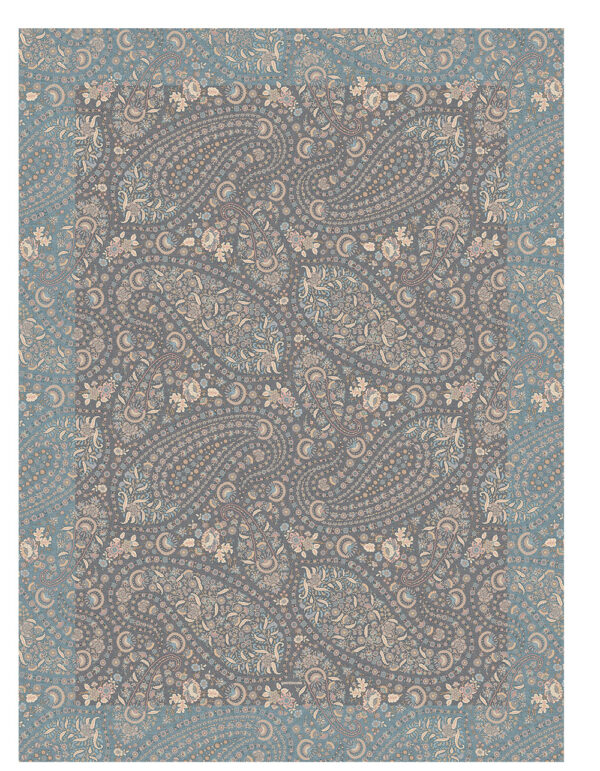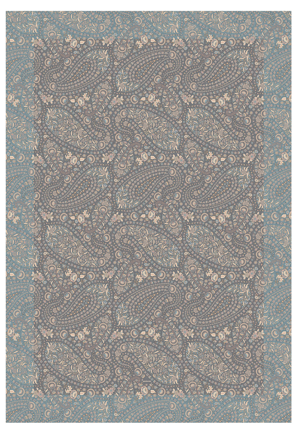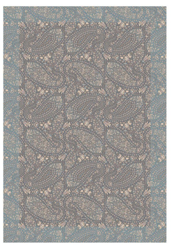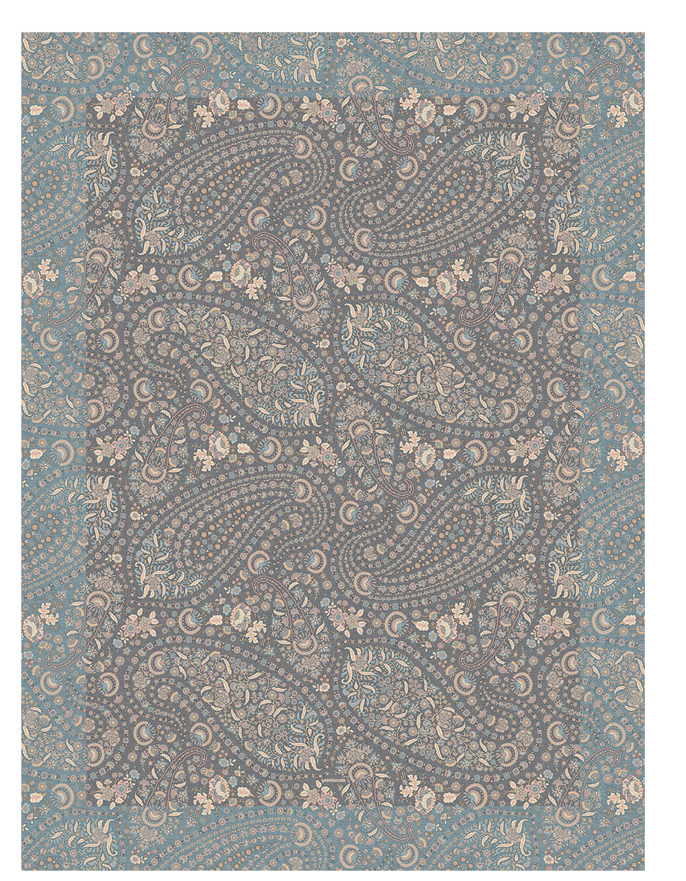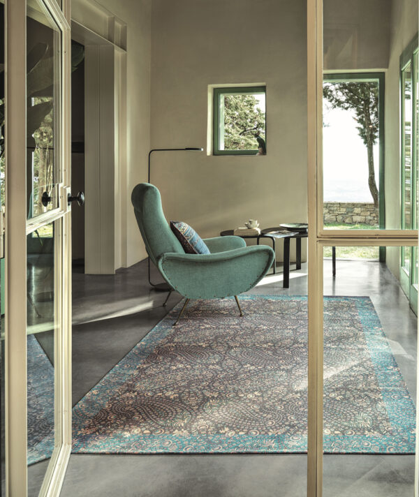 Die Musterungen und Ornamente schweben über dem dunklen Grau und dem schimmernden Blau und erwecken so den Eindruck und das Ambiente von italienisch-orientalischer Eleganz.