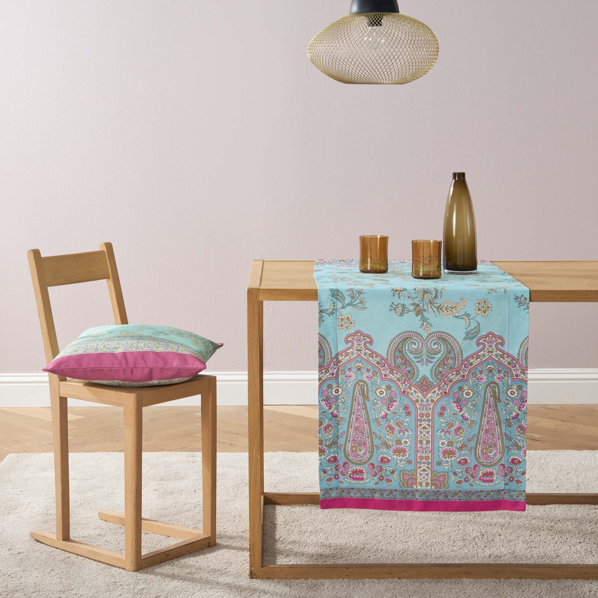 Der Bassetti Tischläufer Indian Roses T1 sorgt in Ihrem Esszimmer oder auf jedem anderen Tisch Ihrer Einrichtung für ein wundervolles Ambiente. Im Zentrum des Designs des Tischläufers Indian Roses T1 von Bassetti stehen filigrane Ton-in-Ton-Blumen in sanften Farbschattierungen, die dem Muster eine subtile Eleganz verleihen. Der dekorative Volant kombiniert reiche florale Elemente mit dynamischen Paisleymotiven, die durch lebendige und kräftige Farben betont werden. Die zarten Pastellfarben des Bassetti Tischläufers Indian Roses T1 erstrahlen in Jade, Kamelienrosa und einem Hauch Fuchsia.