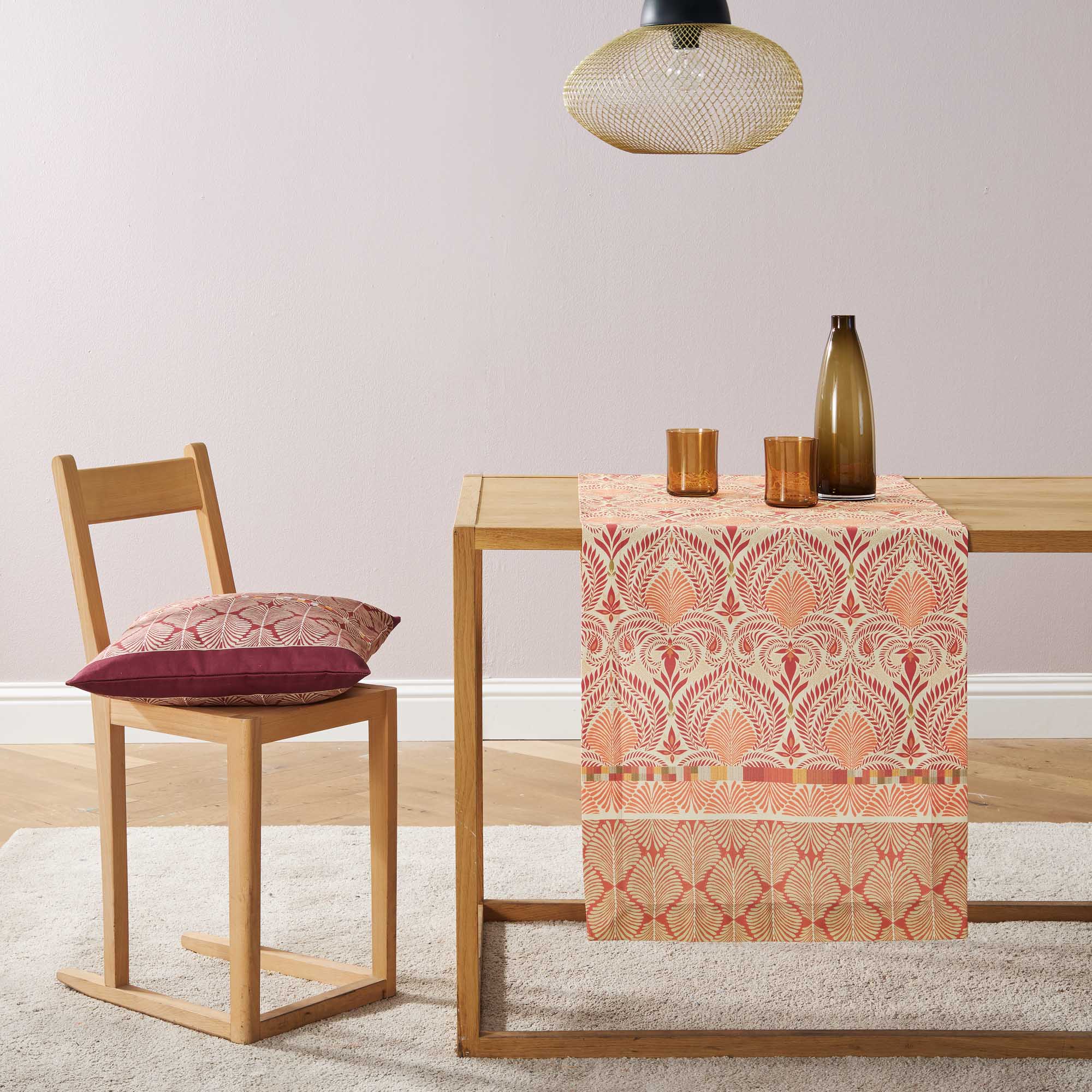 Die Farbgebung von intensivem Ziegelrot, warmem Mandarine, tiefem Amarant und sanftem Elfenbein spiegelt die erdige Wärme Afrikas wider und sorgt für ein elegantes, zugleich lebendiges Ambiente. Durch diese facettenreiche Farbkomposition passt der Tischläufer sowohl in moderne als auch klassische Wohnräume und setzt dekorative Akzente auf jedem Tisch – sei es beim festlichen Dinner, beim sommerlichen Brunch oder als stilvolle Ergänzung für den Alltag.