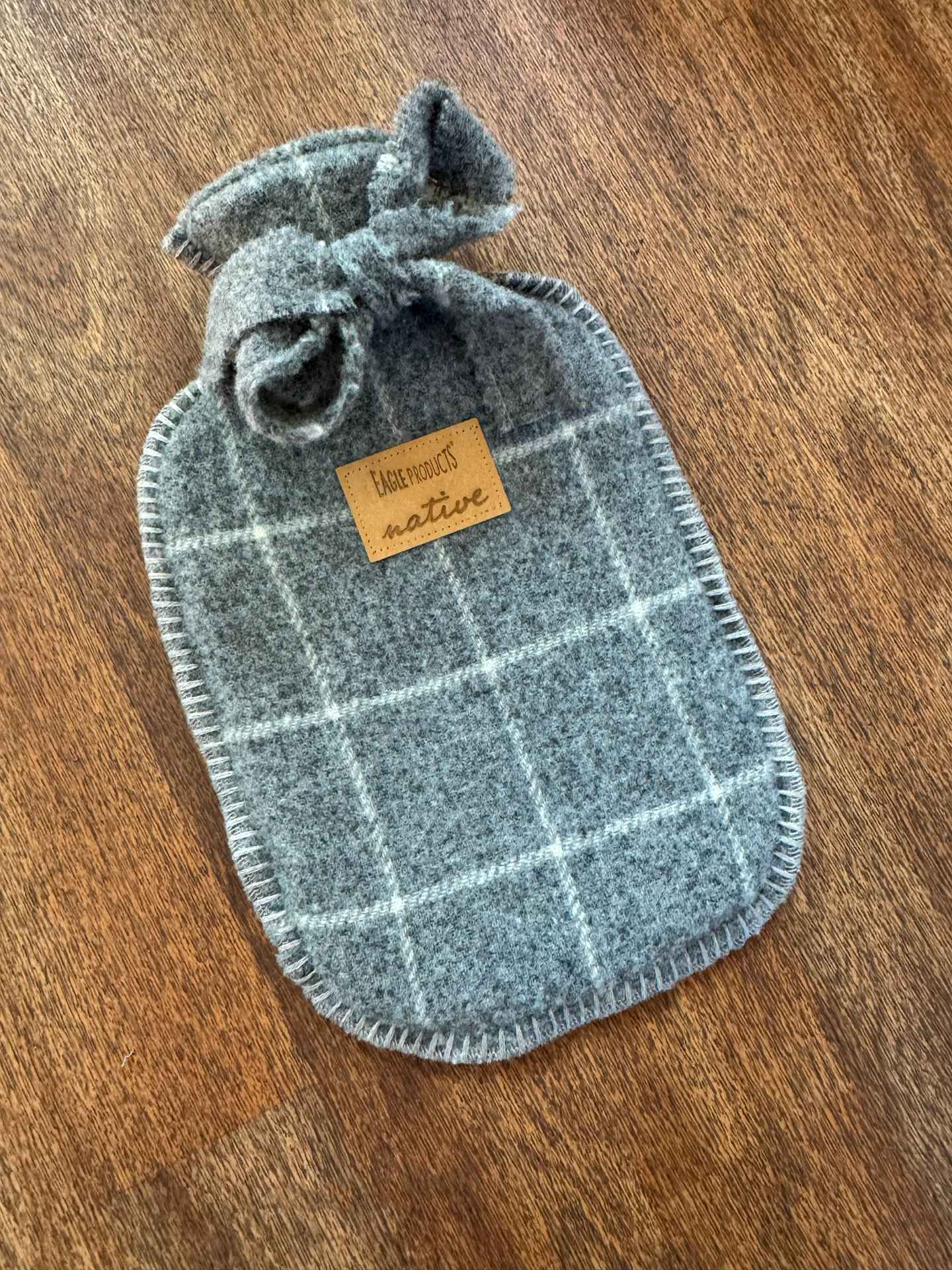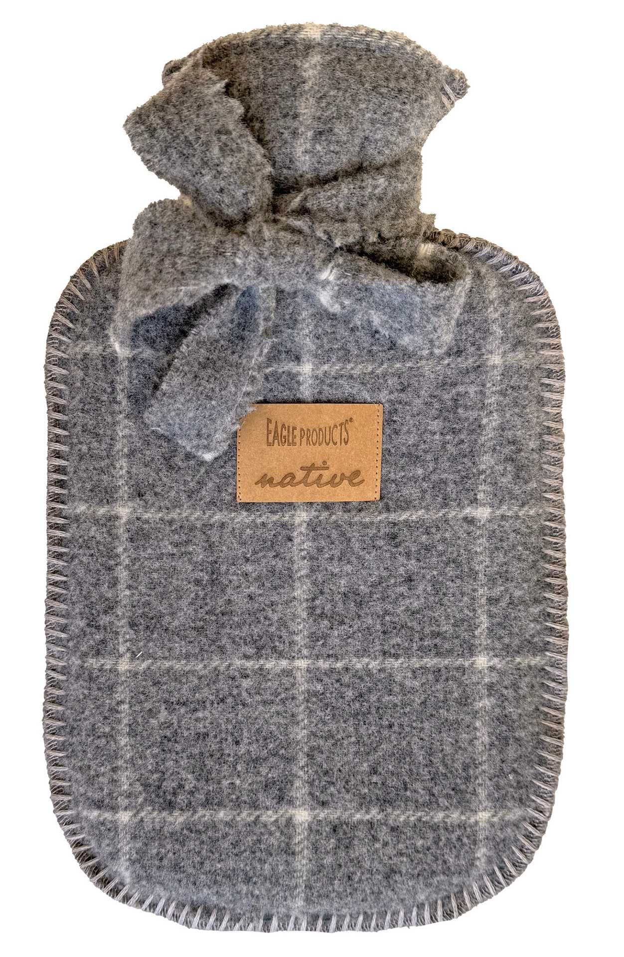 Die Wärmflasche passend zur Native-Decke Franz. Das neutrale Fensterkaro auf grauem Grund passt überall. Die Wolle von fränkischen Schafen fühlt sich wunderbar weich an und wärmt angenehm. Mit der kleinen Schleife am Flaschenhals kann sie auch ein wunderbares Geschenk sein. Art. Franz-WF, 100% Merino-Schurwolle aus Bayern, Made in Germany